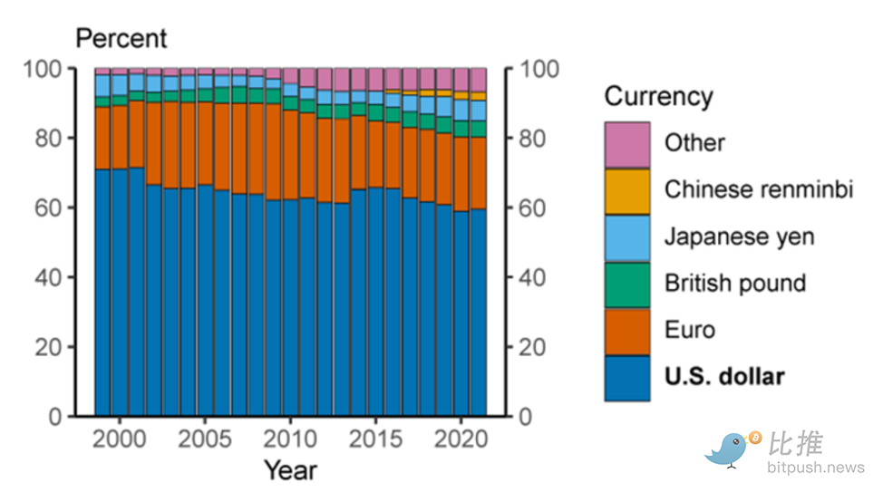 世界各地的中央银行和机构更偏好以美元相互交易。据美联储发布的一份报告,美元在官方货币储备、外汇交易量、外币债务工具、跨境存款和跨境贷款中占据主导地位。