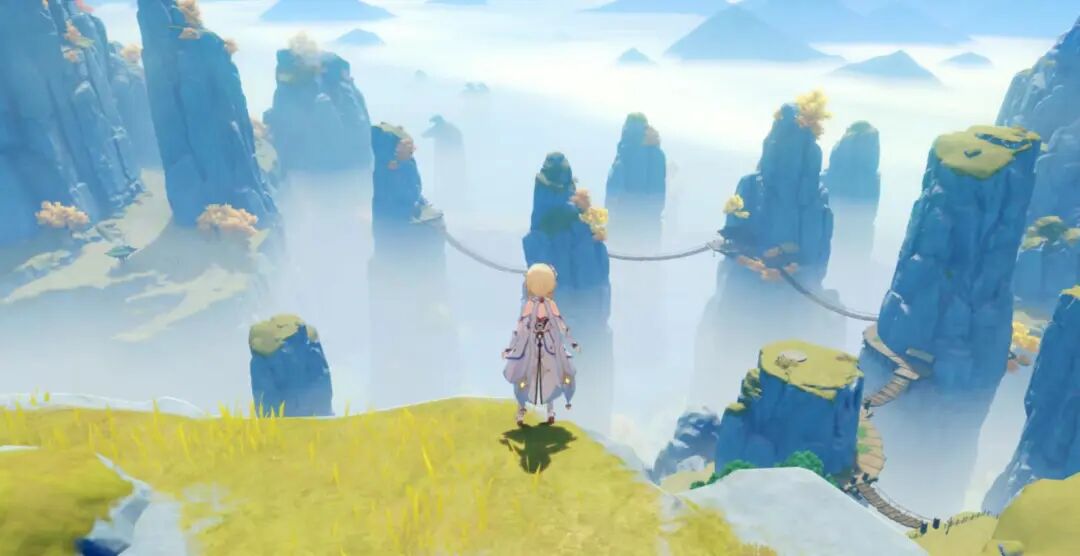 从璃月开始,《原神》就开始在地图纵深方面做了一些尝试,像群山林立的绝云间,通过垂直方向的内容扩展来丰富游戏内容。