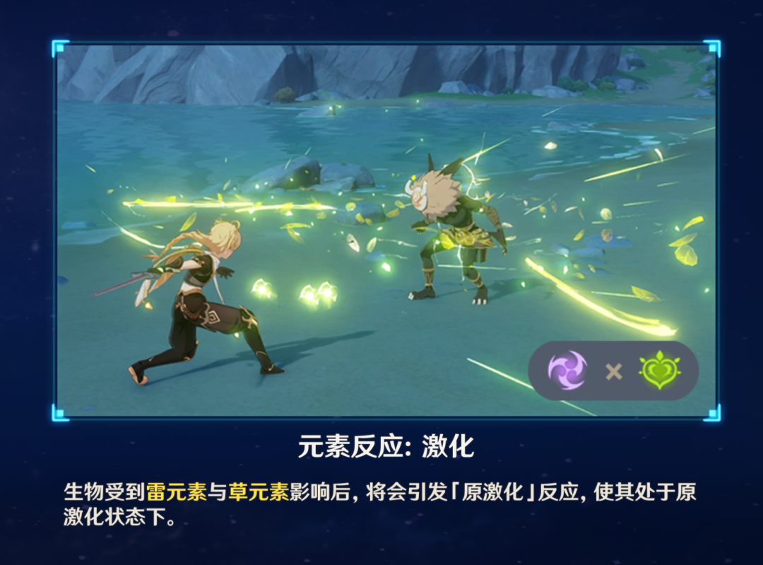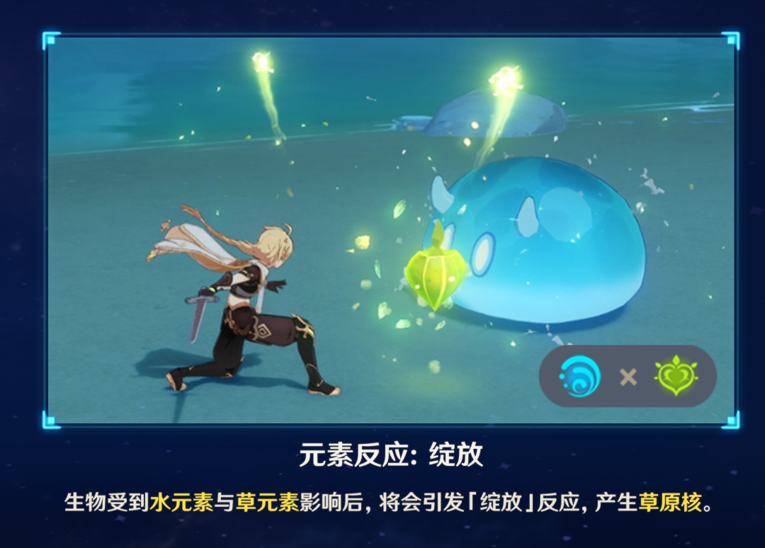 此次草元素最核心的两大反应分别是雷草元素的「激化」反应与水草元素的「绽放」反应,基于这两种反应还可以进一步实现多元素或多次元素反应。