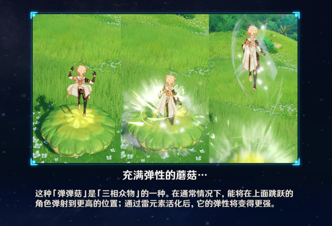 其实不只是四叶印,须弥的很多探索设计都能看到《原神》以往版本的一些影子。比如可以与雷元素反应从而增强弹跳能力的蘑菇,它是「三相众物」的一种,实际上承担着过往地图中风场的功能,同时在趣味性和适配性上提高了游玩体验。