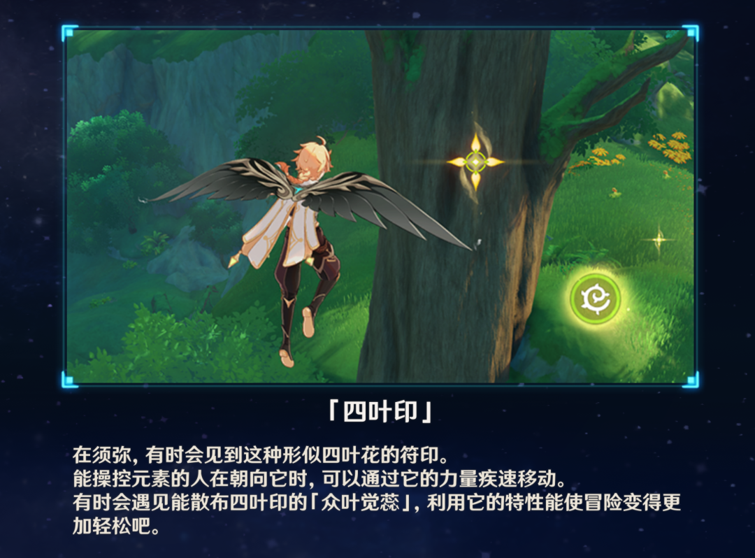 如果要问什么是须弥最惊喜的设计,我相信有许多人的答案都会是“四叶印”。不同于稻妻“雷种子”带来的光影穿梭之感,须弥的“四叶印”给人一种使用钩索在丛林中穿梭的既视感,更加符合地区特色,其数量与分布位置大大提高了探索的便利度与流畅感。