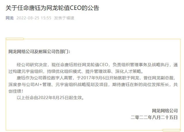 8月25日下午,网龙网络公司发布公告称“经公司研究决定,现任命唐钰担任网龙轮值CEO,负责组织管理事务及战略执行,通过构建元宇宙组织,持续优化组织模式、提升管理效率、深化人才策略。”
