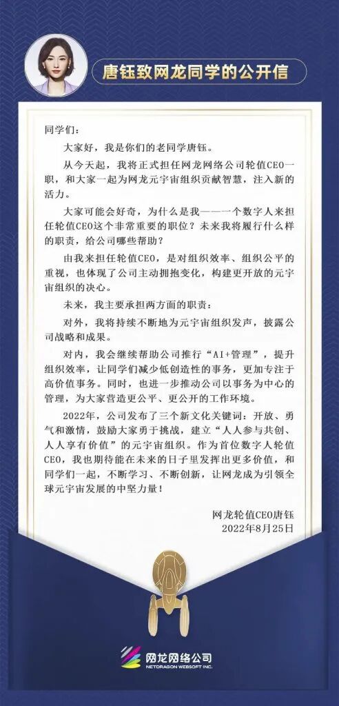 不过不同于普通的公司高层人事变动,此次网龙新的轮值CEO唐钰本质上是一位“数字人”。