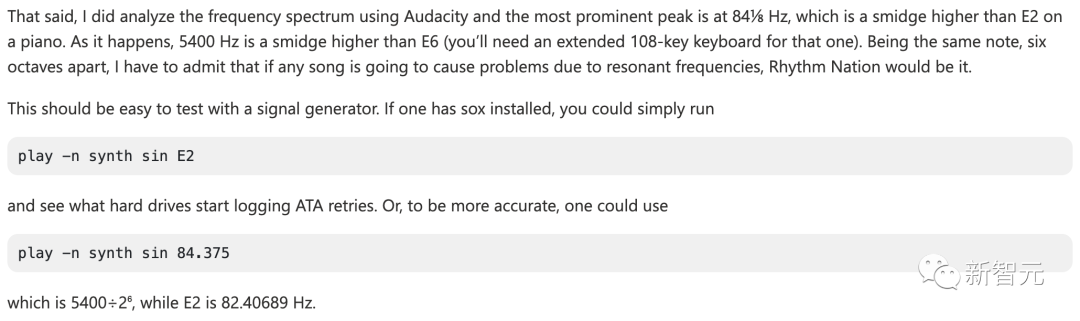 原来,「Rhythm Nation」这首歌中的一段频率,是笔记本电脑里配备的5400转硬盘的共振频率之一。为此,制造商在电脑加了一个自定义过滤器,可以在播放过程中检测并去除那段频率。问题就这样解决了,大家又可以愉快地看MV了。(就是下面这个)是不是感觉很「荒诞」?真的有这么弱鸡的笔记本电脑么?一位网友也这么觉得,于是他特地用Audacity对歌曲的频谱进行了分析。他表示,最突出的峰值在84Hz,比钢琴上的E2高一点。碰巧的是,5400 Hz比E6还要高一点。由于是同一个音符,相隔六个八度,我不得不承认,如果有哪首歌会因为共振频率而导致问题,那就是「Rhythm Nation」。想必,终于能松一口气的制造商,一定会给这个精妙绝伦的解决方案,贴上一个数字版的「请勿删除」标签。只是在多年之后,大概就没有人还记得,为什么电脑里会有这么个小东西了。不知道他们现在的笔记本电脑里,是不是还有这个音频过滤器,保护着一款已经不再使用的硬盘型号不受损坏。