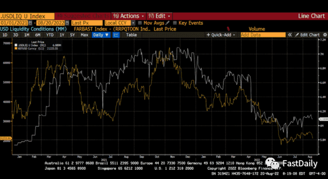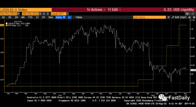美联储基金上限(黄色)与美元流动性状况(白色)对比
