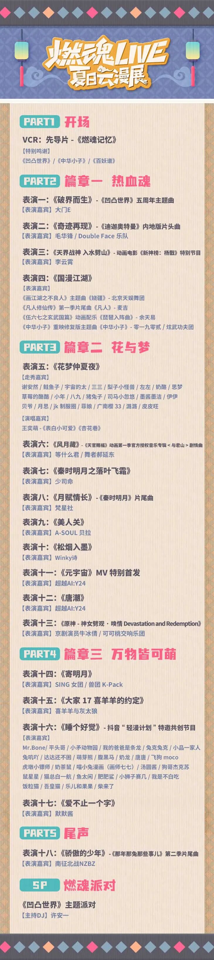 从歌会节目单就不难看出,在这场以“燃魂live”为主题的歌会里,大部分歌曲选自《画江湖》《凡人修仙传》《刺客伍六七》这些国产动画,既有《秦时明月》《喜羊羊与灰太狼》这些颇有些年头的作品,也包括《画江湖》《凹凸世界》这些近年来逐渐成为新一代“童年记忆”的动画。