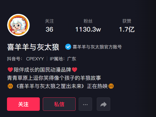 如今在抖音上粉丝数最多的“二次元类”账号,恰恰正是《喜羊羊与灰太狼》的官号。
