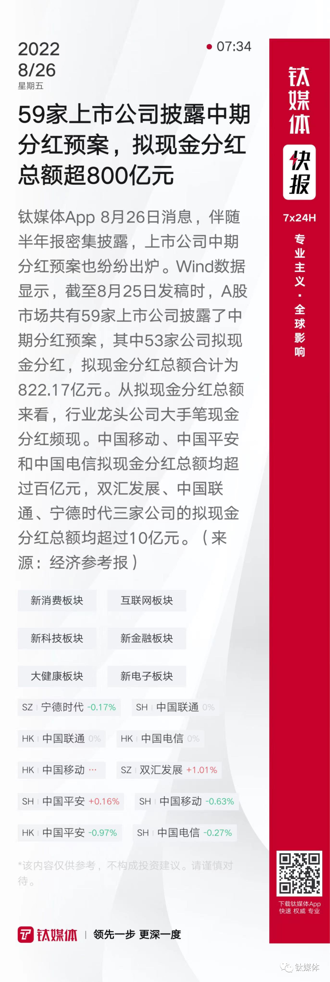 【59家上市公司披露中期分红预案,拟现金分红总额超800亿元】