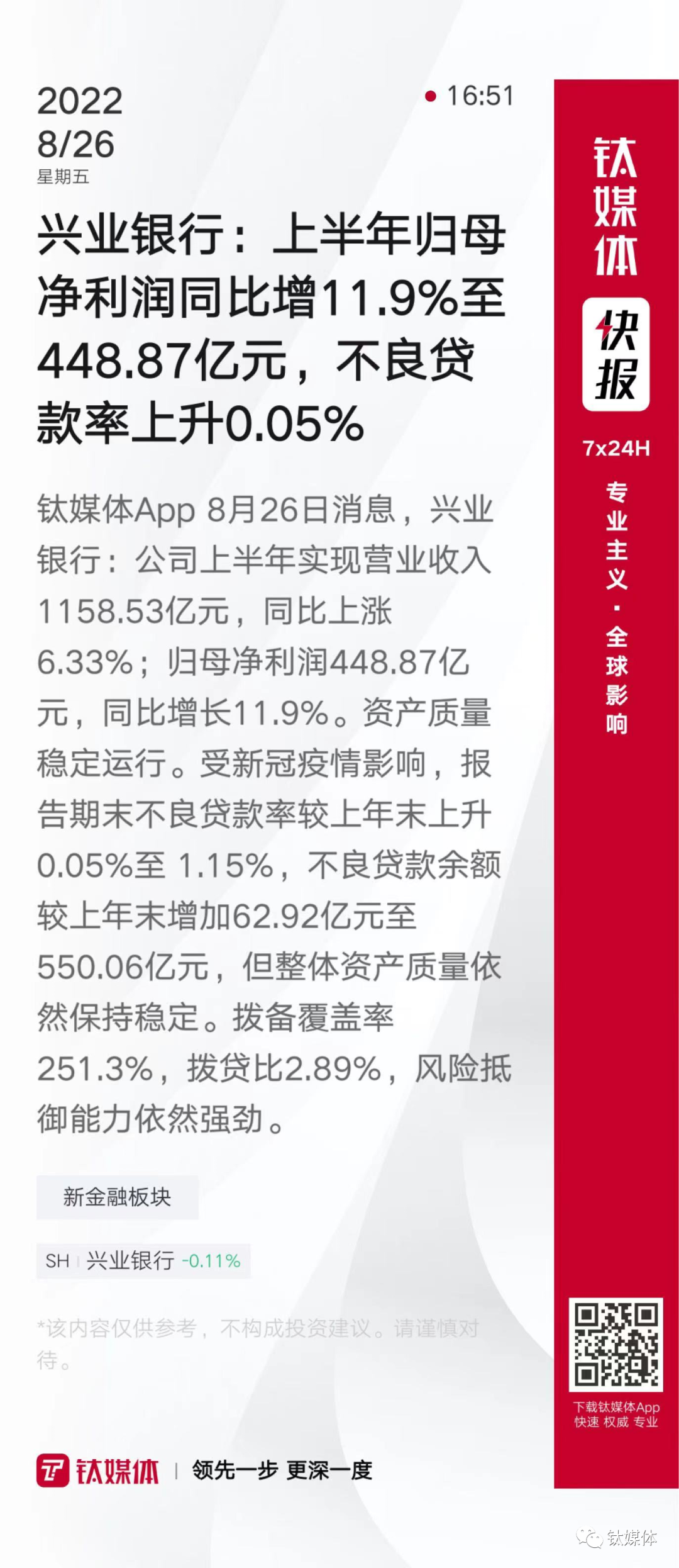 【兴业银行:上半年归母净利润同比增11.9%至448.87亿元,不良贷款率上升0.05%】