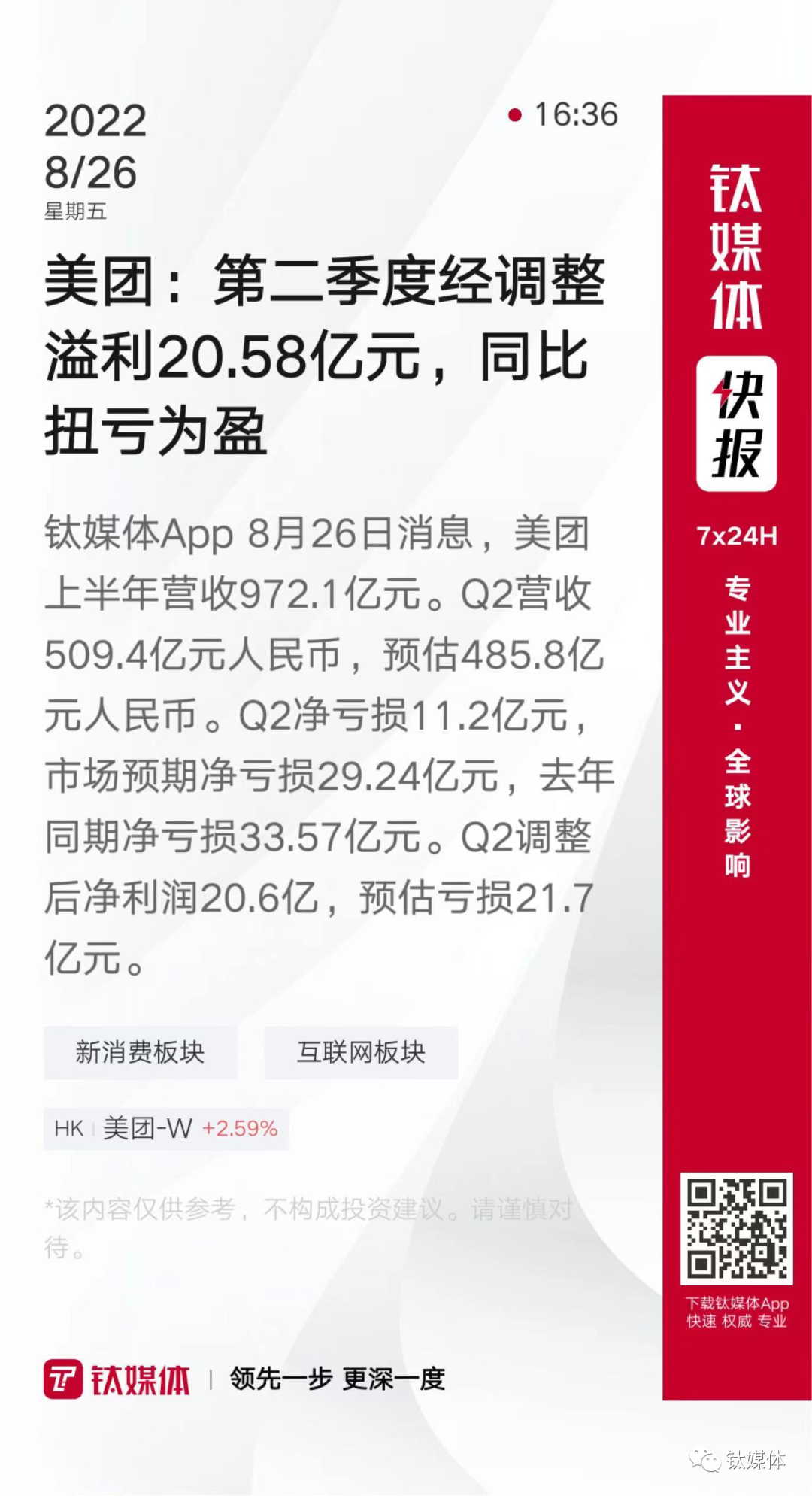 【美团:第二季度经调整溢利20.58亿元,同比扭亏为盈】
