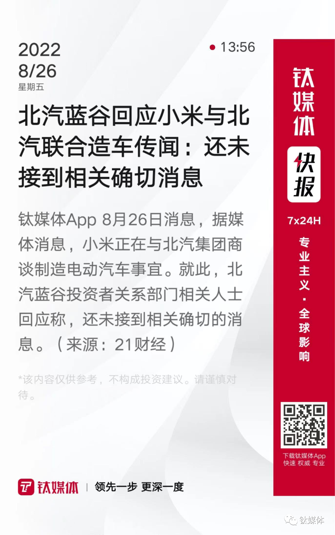 【北汽蓝谷回应小米与北汽联合造车传闻:还未接到相关确切消息】