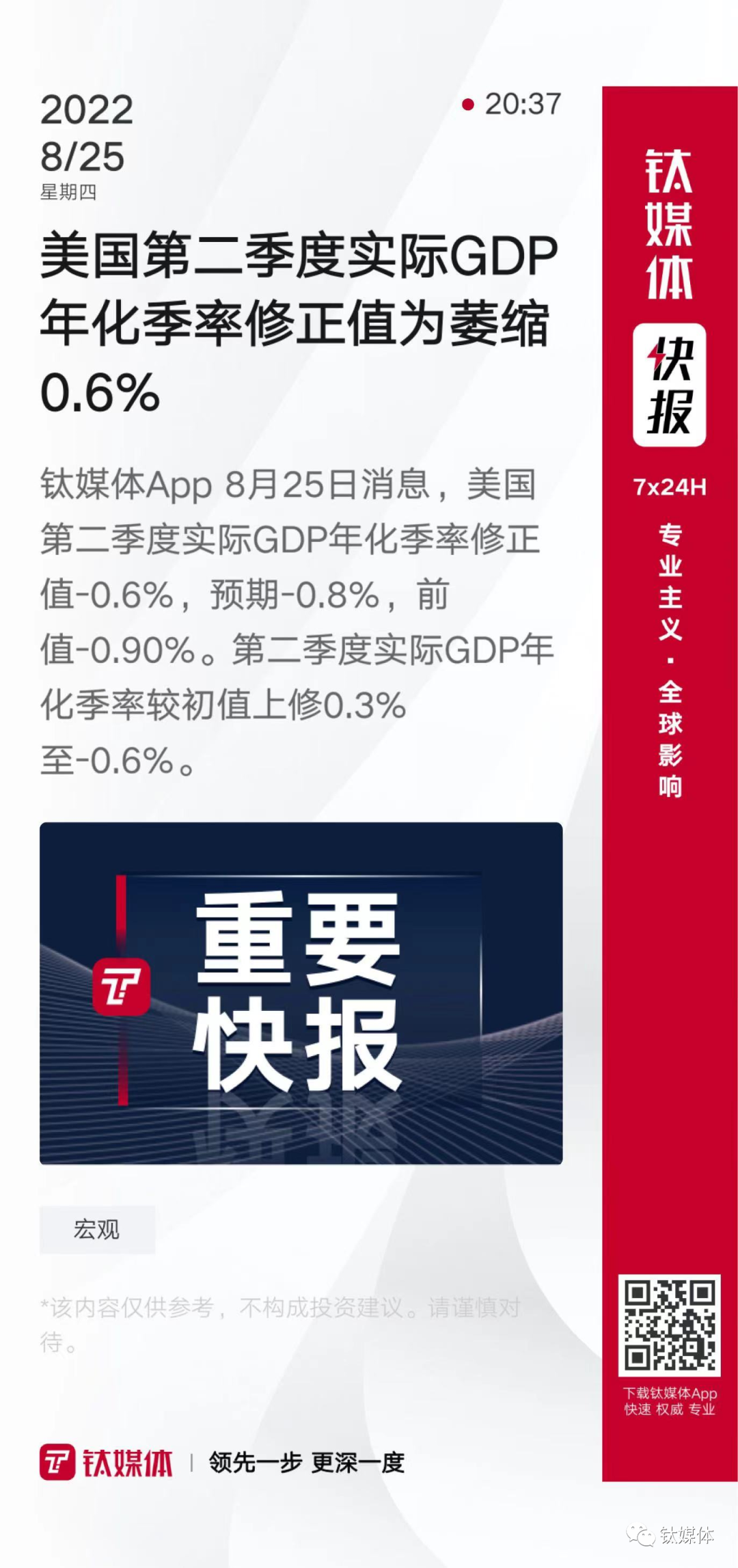 【美国第二季度实际GDP年化季率修正值为萎缩0.6%】