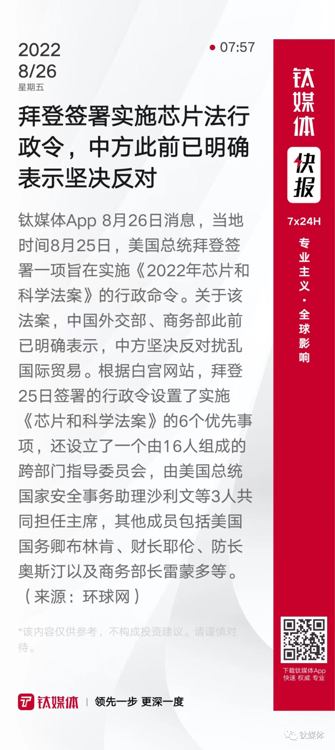 【拜登签署实施芯片法行政令,中方此前已明确表示坚决反对】