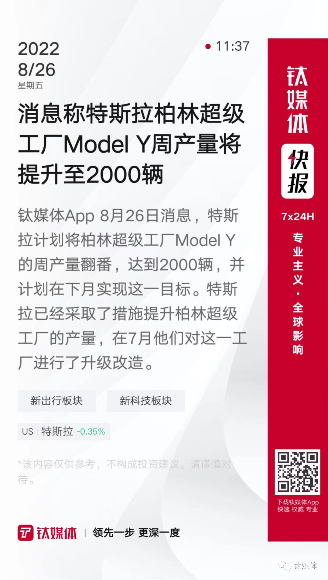 【消息称特斯拉柏林超级工厂Model Y周产量将提升至2000辆】