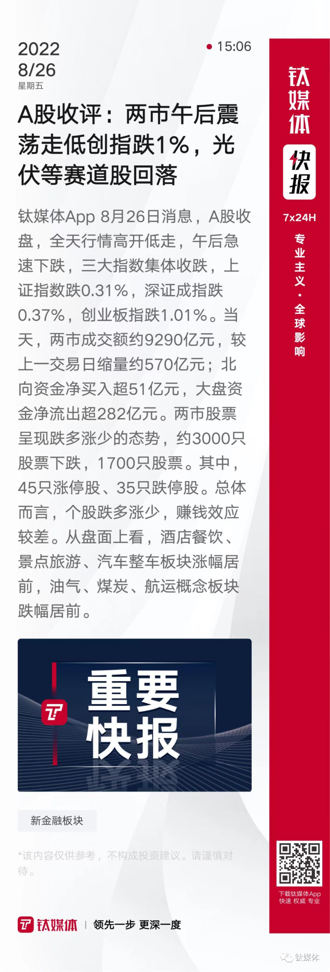 【A股收评:两市午后震荡走低创指跌1%,光伏等赛道股回落】
