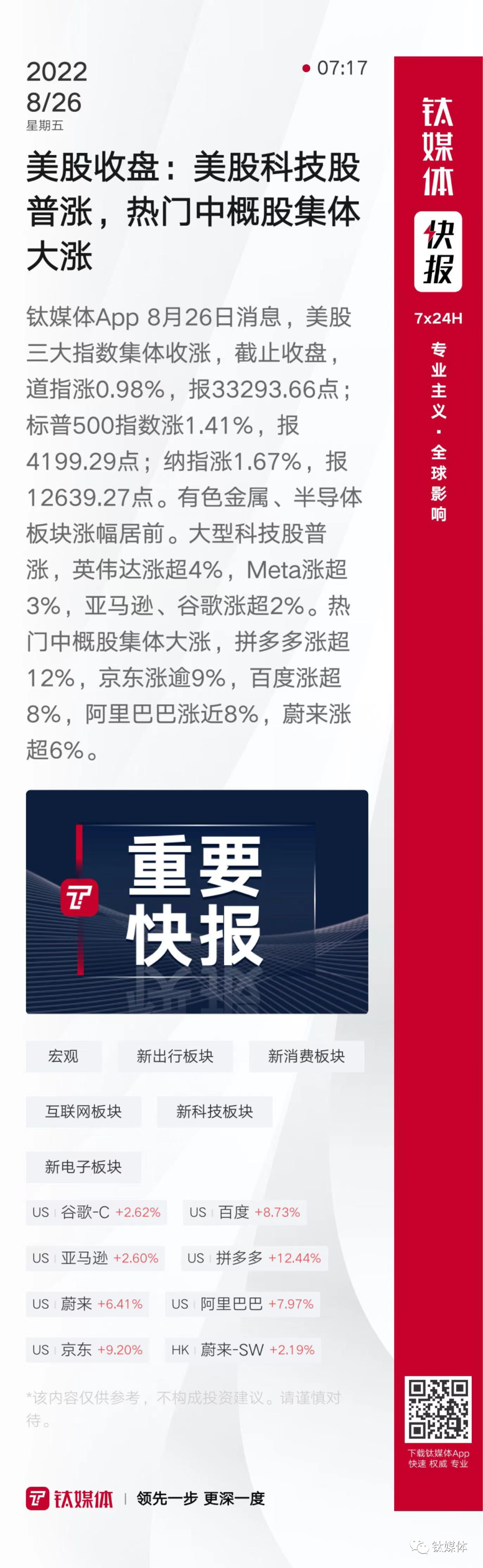 【美股收盘:美股科技股普涨,热门中概股集体大涨】
