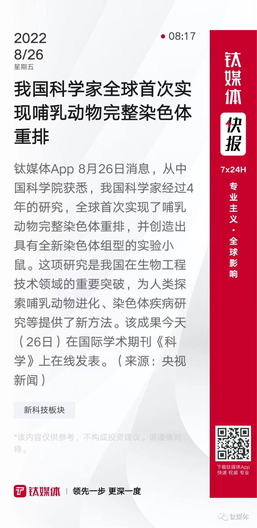 【我国科学家全球首次实现哺乳动物完整染色体重排】