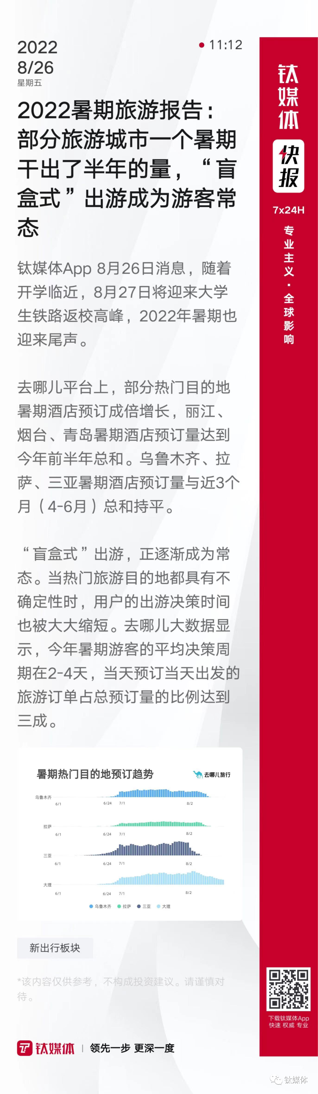 【2022暑期旅游报告:部分旅游城市一个暑期干出了半年的量,“盲盒式”出游成为游客常态】