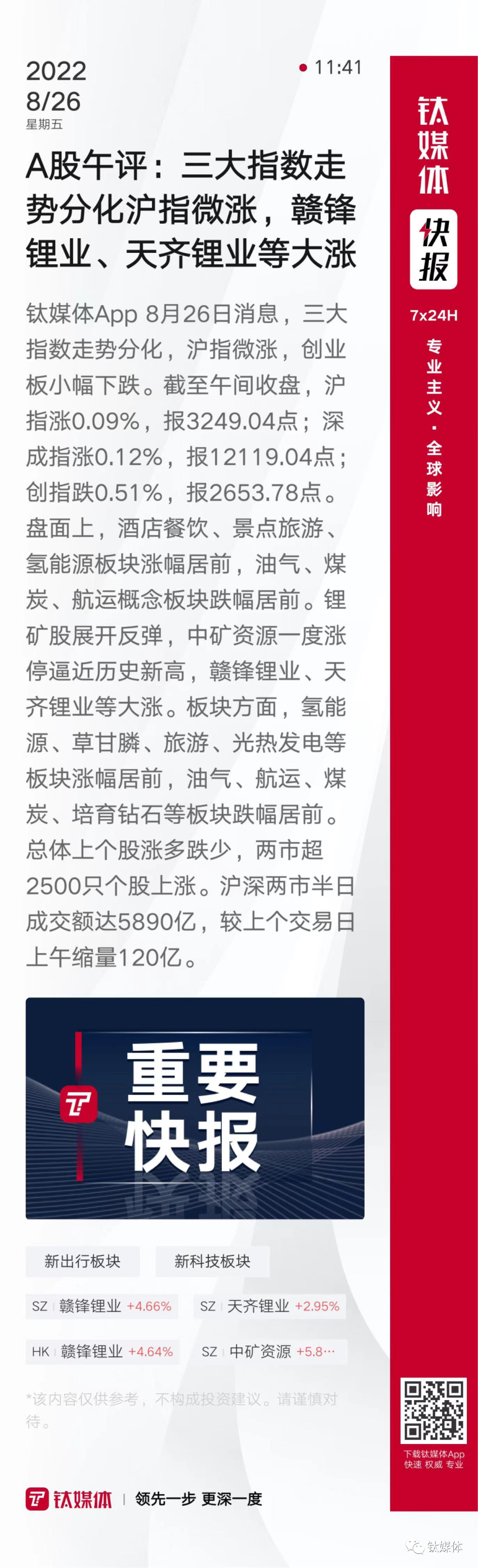 【A股午评:三大指数走势分化沪指微涨,赣锋锂业、天齐锂业等大涨】
