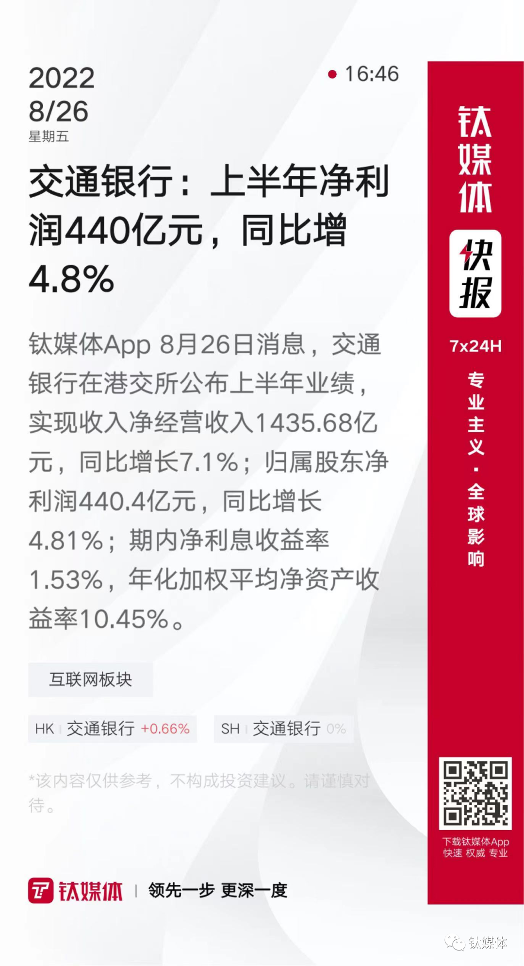 【交通银行:上半年净利润440亿元,同比增4.8%】