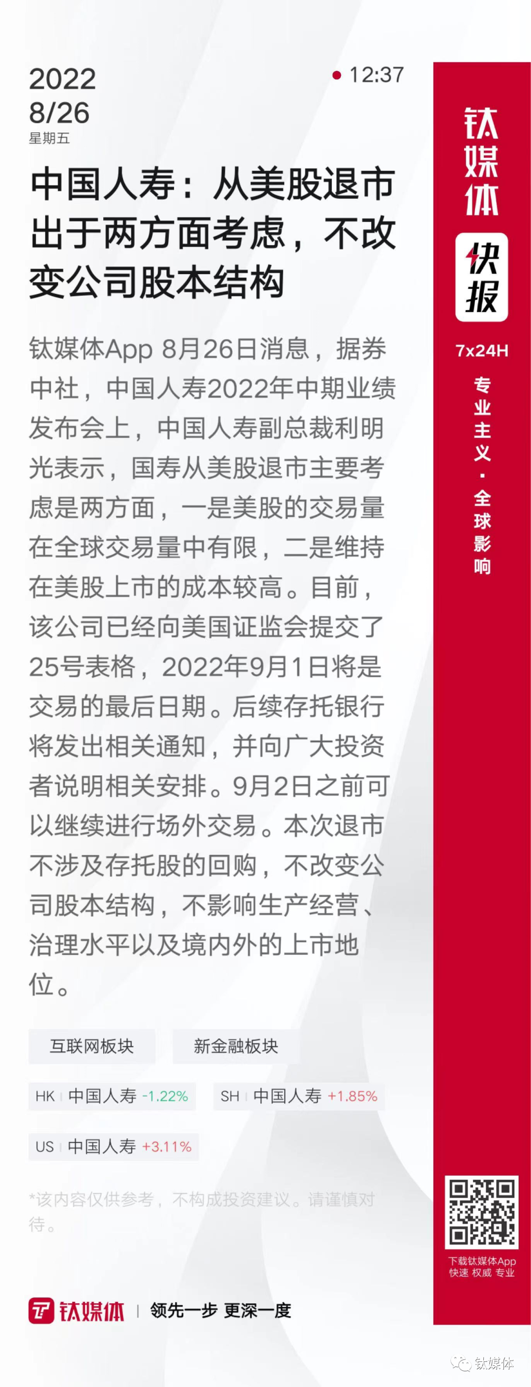 【中国人寿:从美股退市出于两方面考虑,不改变公司股本结构】