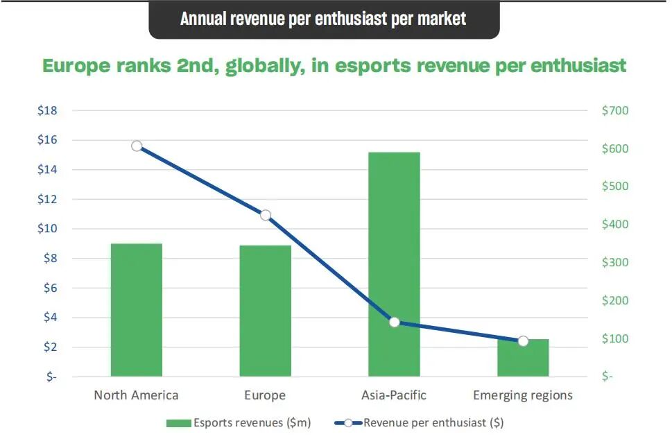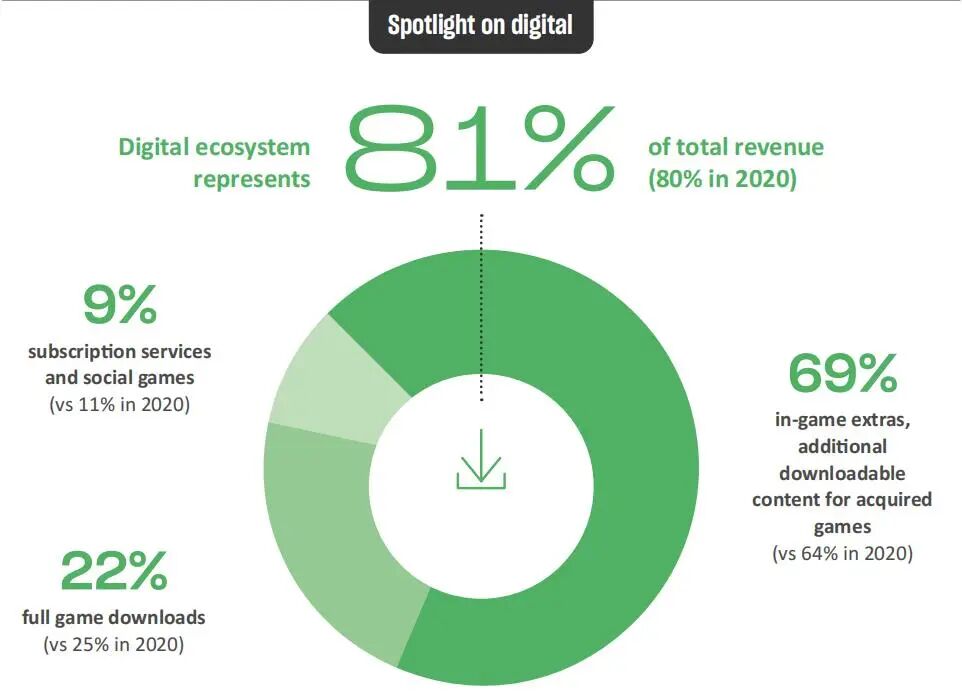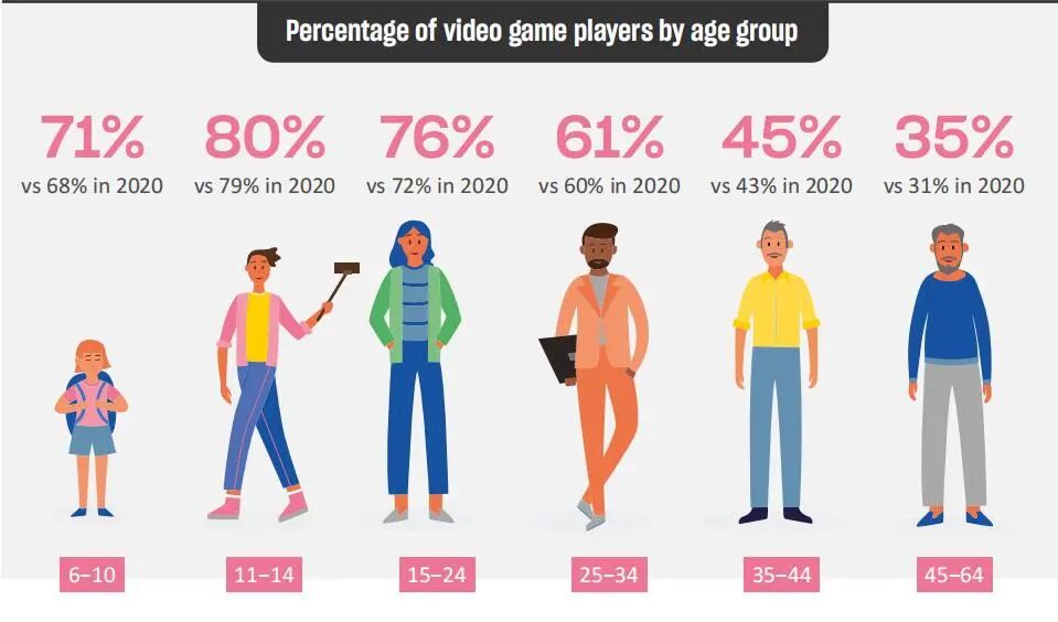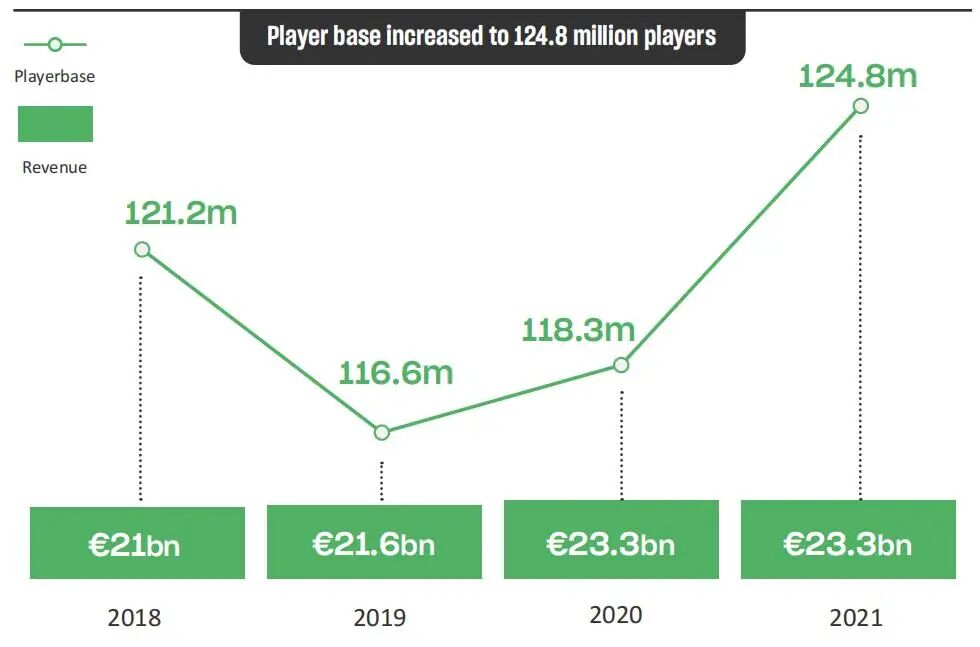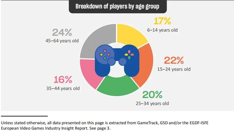 在2020年,欧盟地区有4600家游戏工作室和发行商,这些公司雇佣了7.4万人,为欧洲带来了166亿欧元年收入。2021年,欧洲游戏市场规模稳定在233亿欧元,进入后疫情时代之后,玩家数同比增长6%,玩游戏在各个年龄段都很受欢迎,其中45-64岁中老年人玩家数量增长最快。