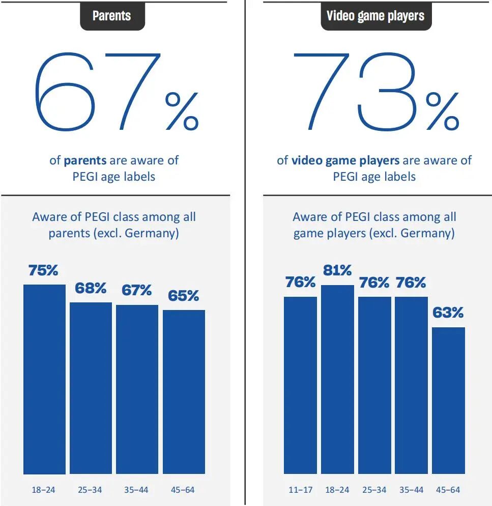 北美和欧洲的评级系统也有差异,ESA报告称美国84%的家长知道ESRB评级,而欧洲家长知道PEGI年龄分级的比例只有67%。这两个评级标准也是不同的,但由于两者分类并不相同,因此没办法做出比较。