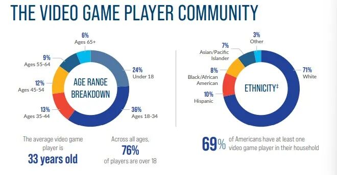 ESA报告包含了用户群年龄、性别和种族,欧洲报告只有年龄和性别。Key Facts报告则指出,儿童游戏内购现象出现大幅下滑,从2018年的42%降至2020年的19%。