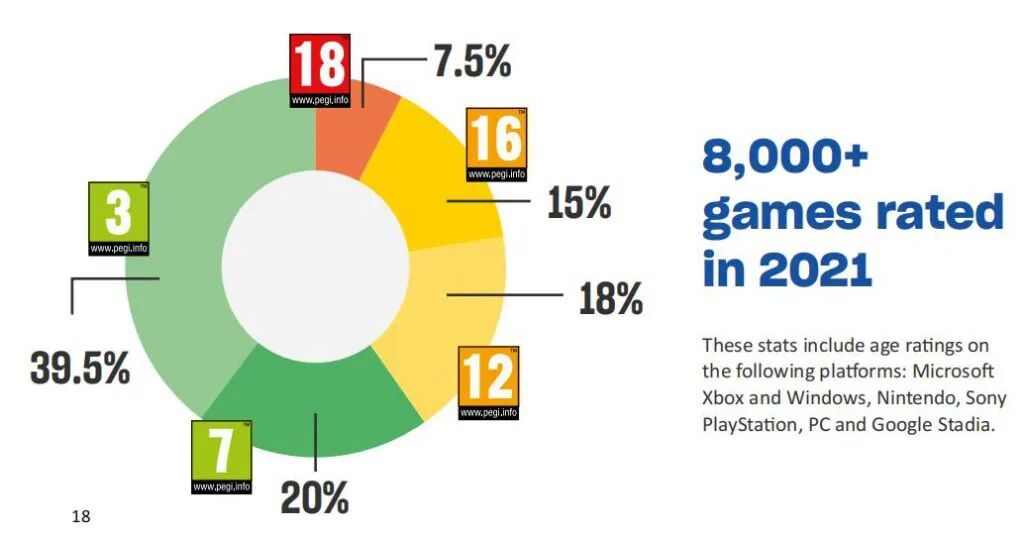 在去年拿到PEGI评级的8000多款游戏当中,39.5%的游戏产品的年龄评级最低为3,高年龄段评级占比数量逐年降低。20%游戏拿到了7岁评级,18%的游戏是12岁,还有15%游戏评级为16岁,受到限制最多的18岁评级游戏占比数量只有7.5%。