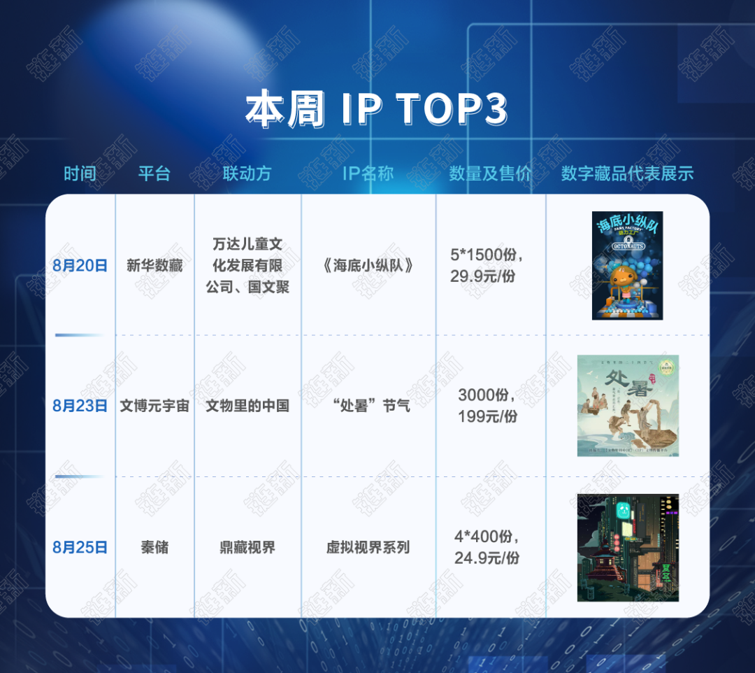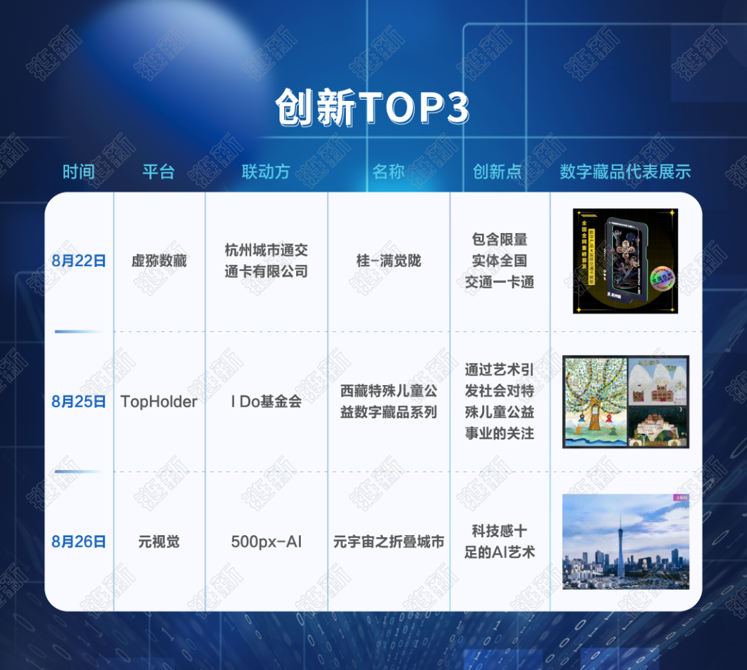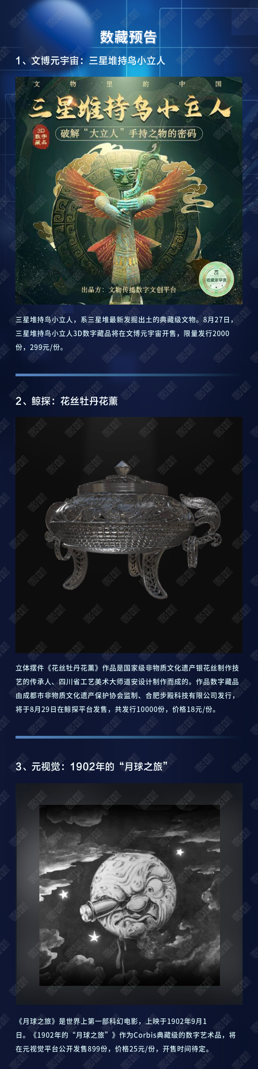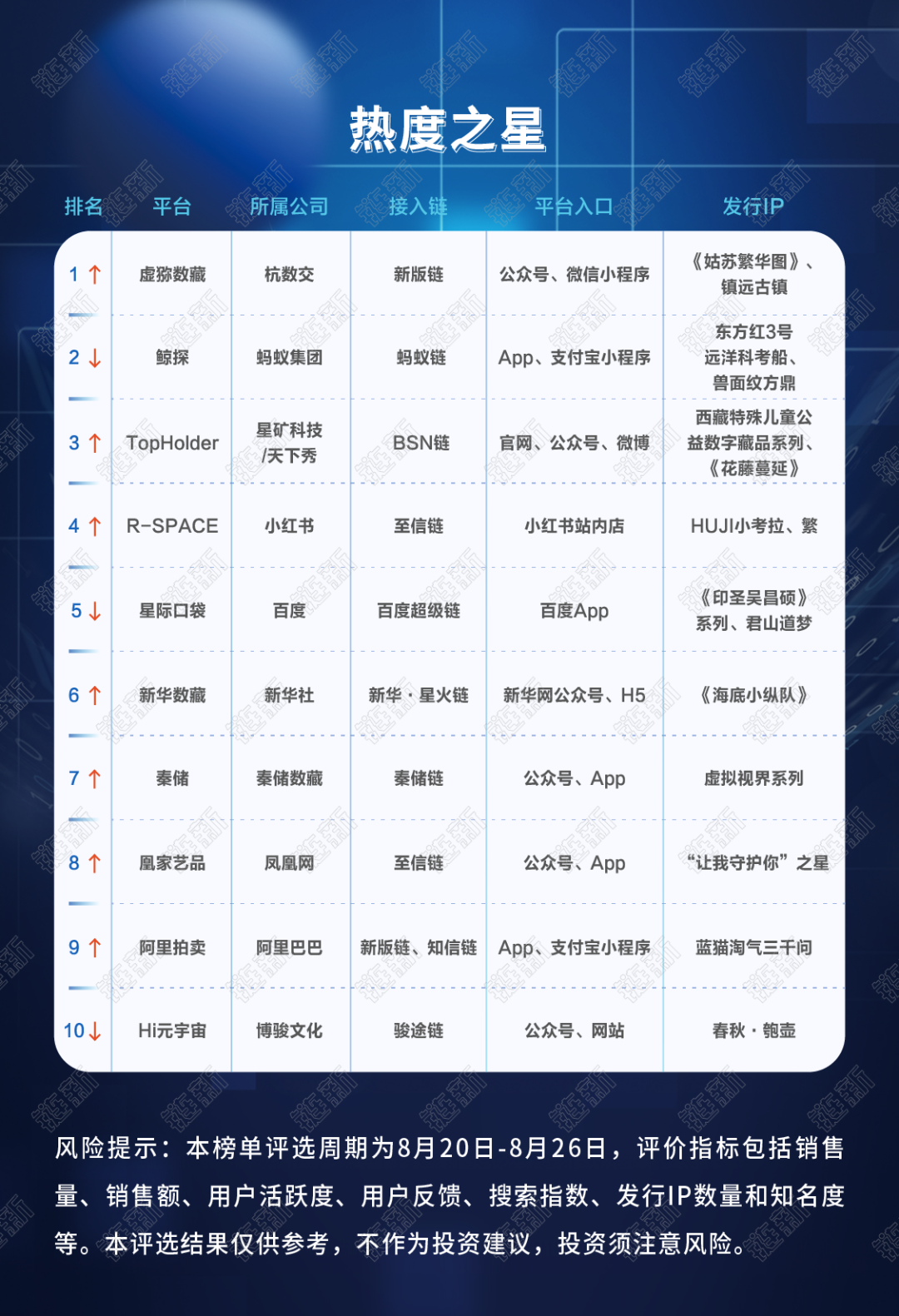 8月24日,上海数据交易所(下称“上海数交所”)数字资产板块正式设立,并联合“回力”和“哔哩哔哩”首次发行数字资产“回力DESIGN-元年”。上海数交所数字资产有“四不五可六类”原则:“四不”即底层商品为金融资产的不上市,无明确经济价值的不上市,数字资产产权不清晰的不上市,不符合国家法律法规的不上市;“五可”即可穿透、可确权、可定价、可流通、可溯源;“六类”即现阶段可交易数字资产主要包括文博衍生、数字文创、消费场景、品牌营销、产业应用、数据知识产权等六种类型。此外,《上海数据交易所数字资产板块管理规范(试行)》也正式发布,涵盖了数字资产板块数字资产登记、数字资产公告、参与方权利与义务等规则,可实现数字资产板块合规有序地运营。8月24日,北京市通州区与北京市科委、中关村管委会、北京市经信局联合印发了《北京城市副中心元宇宙创新发展行动计划(2022-2024年)》,提出力争通过3年的努力,培育、引进100家以上元宇宙生态链企业,落地建成30项以上“元宇宙+”典型应用场景项目,推动制定一批元宇宙相关标准,1+N产业空间体系初步形成。《行动计划》提到要集聚数字内容资产,包括探索数字资产权益全生命周期管理,跟踪NFT(非同质化通证)技术前沿动态,大力发展数字资产交易服务。在对行业每周数据进行分析研究的基础上,《链新》联合国家新闻出版署科技与标准综合重点实验室区块链版权中心推出“每周数藏热榜”,助力行业人士深入掌握行业前沿趋势,抢抓区块链文创发展新机遇。