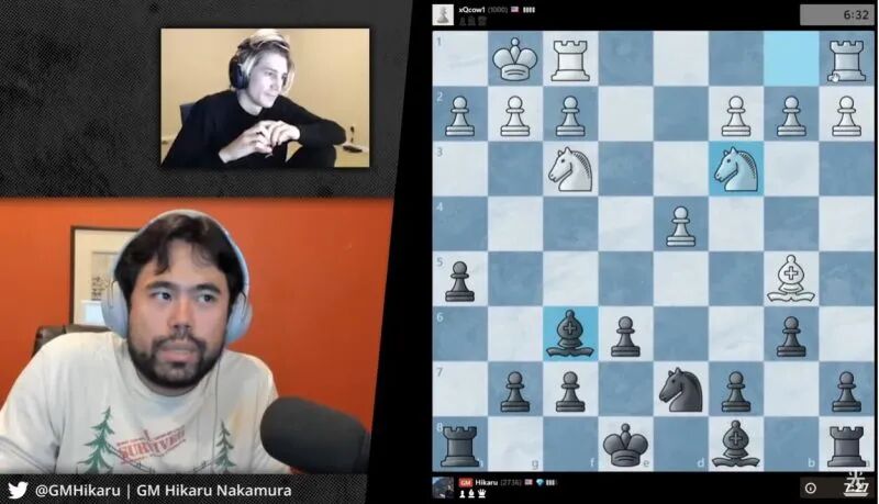 2020年4月的一天,加拿大知名游戏主播xQc突发奇想,尝试在直播中游玩国际象棋,并邀请同为Twitch主播的美国国际象棋特级大师Hikaru Nakamura担任一天的国际象棋教练。这次直播在观众中引起了很好的反响。一方面,观众长久以来一直观看主播游玩各式电子游戏,而象棋作为传统运动的代表,极少在直播的场景中出现,为观众带来了新奇感。另一方面,国际象棋大师Hikaru Nakamura镇静自若的飞速运算与小白xQc在直播中抓耳挠腮思考对策的表现形成了鲜明的对比,为直播带来了极强的喜剧效果。