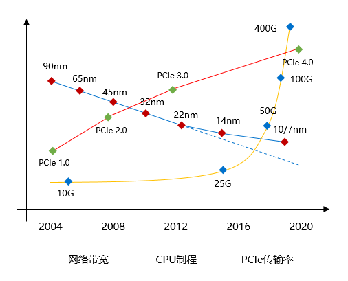 基于服务器处理网络业务可行的最主要原因,是充分利用了服务器的多核并行处理能力,实现了性能的大幅度提升,满足了网络传输的高性能转发诉求。而产生上述这些挑战的根本原因,也是在于服务器的系统架构在处理更大规模网络流量方面并不擅长。网络流量流经服务器的典型路径是由网卡收发报文,再通过 PCIe 总线将数据 DMA 到内存,再由 CPU 来处理内存中的数据,整个处理过程非常漫长,需要经历至少 4 种不同的物理器件,导致成本很难降低,并且任意器件的性能问题都会导致整体性能变差。以 CPU 为例,最近十年间,由于 CPU 制程工艺逐渐接近物理极限,摩尔定律放缓成为事实,依靠 CPU 制程提升来提升处理性能的方法已不可持续。在此背景下,单核性能基本趋近于极限,大多数 CPU 厂商采用多核架构来提升性能。这种趋势的问题在于微突发问题严重依赖单核处理性能,同时共享数据的存在使得网络处理性能无法随核数线性扩展。其他硬件单元,如网卡、PCIe 总线、内存等,也存在类似的问题。从图 2 可以看到网络带宽在近十年取得了爆发式的增长,CPU 制程、PCIe 传输率等影响硬件处理性能的关键指标增长却越来越平缓。在这种背景下,可编程硬件为解决这些问题提供了一种全新的思路。