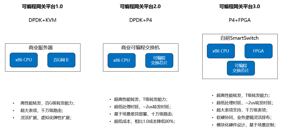针对这些挑战,我们通过多年不断的尝试和技术革新,由早期的纯软件转发平台,演进到基于可编程硬件的转发平台,再到软硬一体化的可编程网络平台,提高了云网络的弹性能力,降低了网络运营成本,为各类云服务的大规模应用铺平了道路。