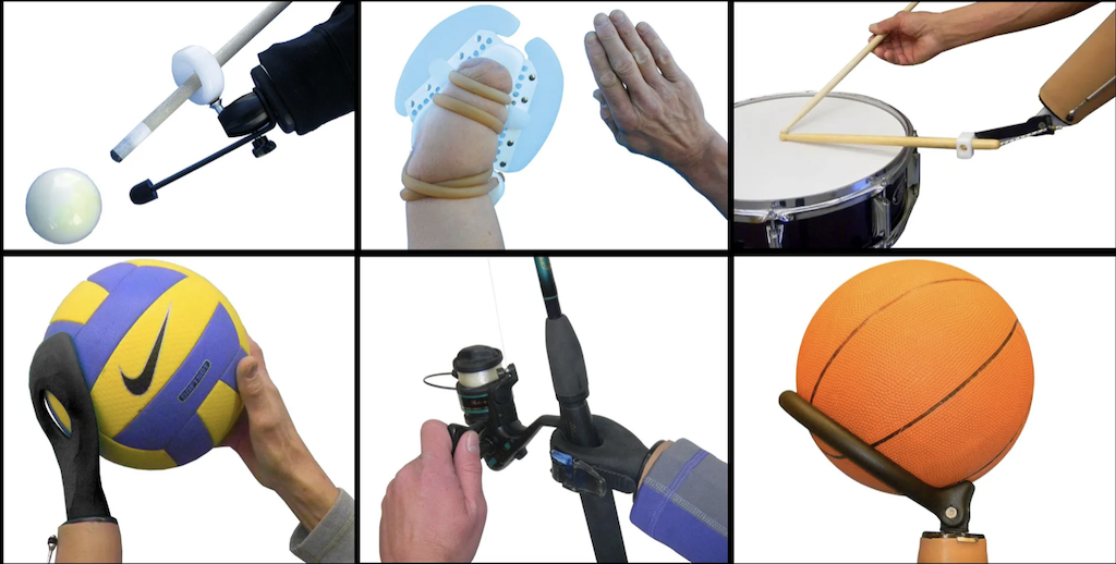 总部位于科罗拉多州博尔德的 TRS 是为数不多的运动专用假肢附件制造商之一,这些产品通常更耐用,而且性价比更高。产品材质上多是使用塑料和硅胶附件,比如,用于俯卧撑的柔软蘑菇形装置、用于举重的棘轮夹和用于游泳的凹形鳍等。