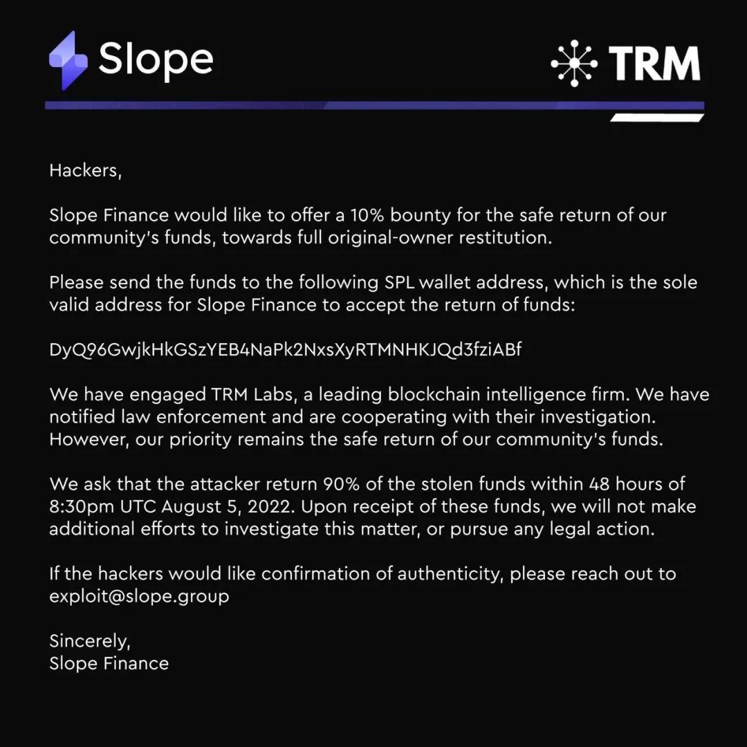 Slope 团队给黑客留了 48 小时的时间来归还资产,但这个赏金要约并未得到黑客的回应。