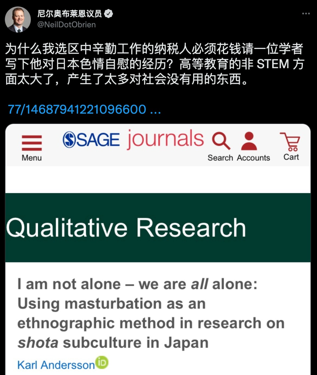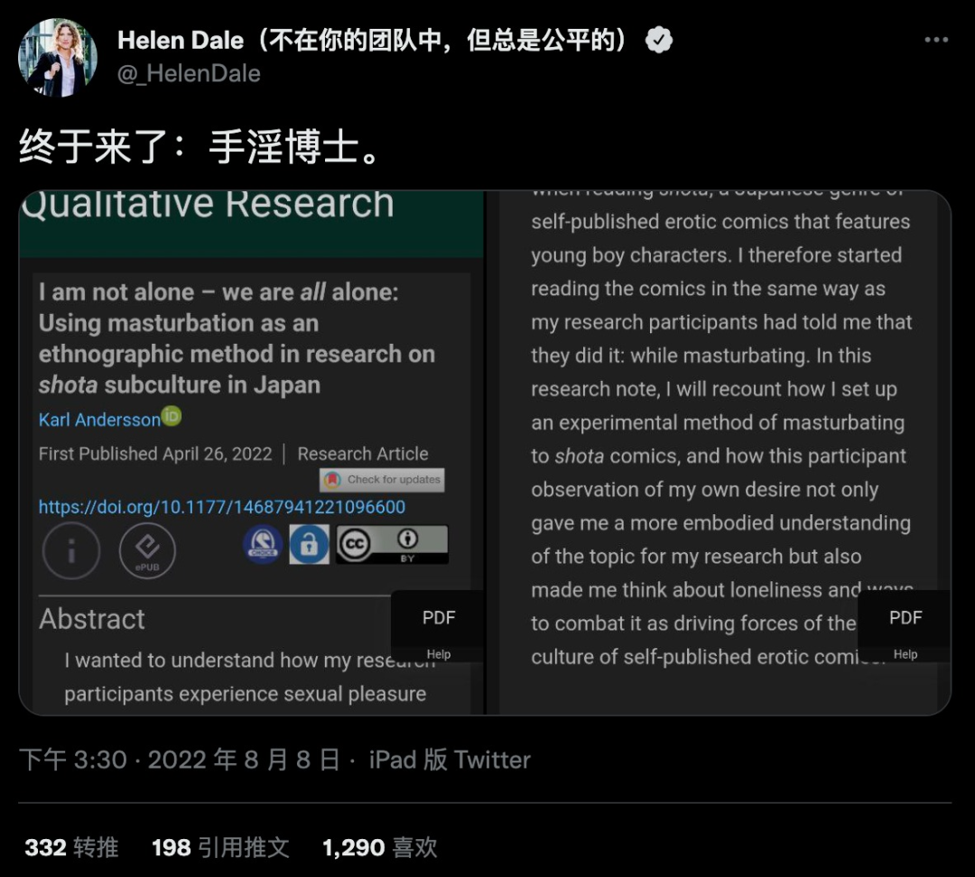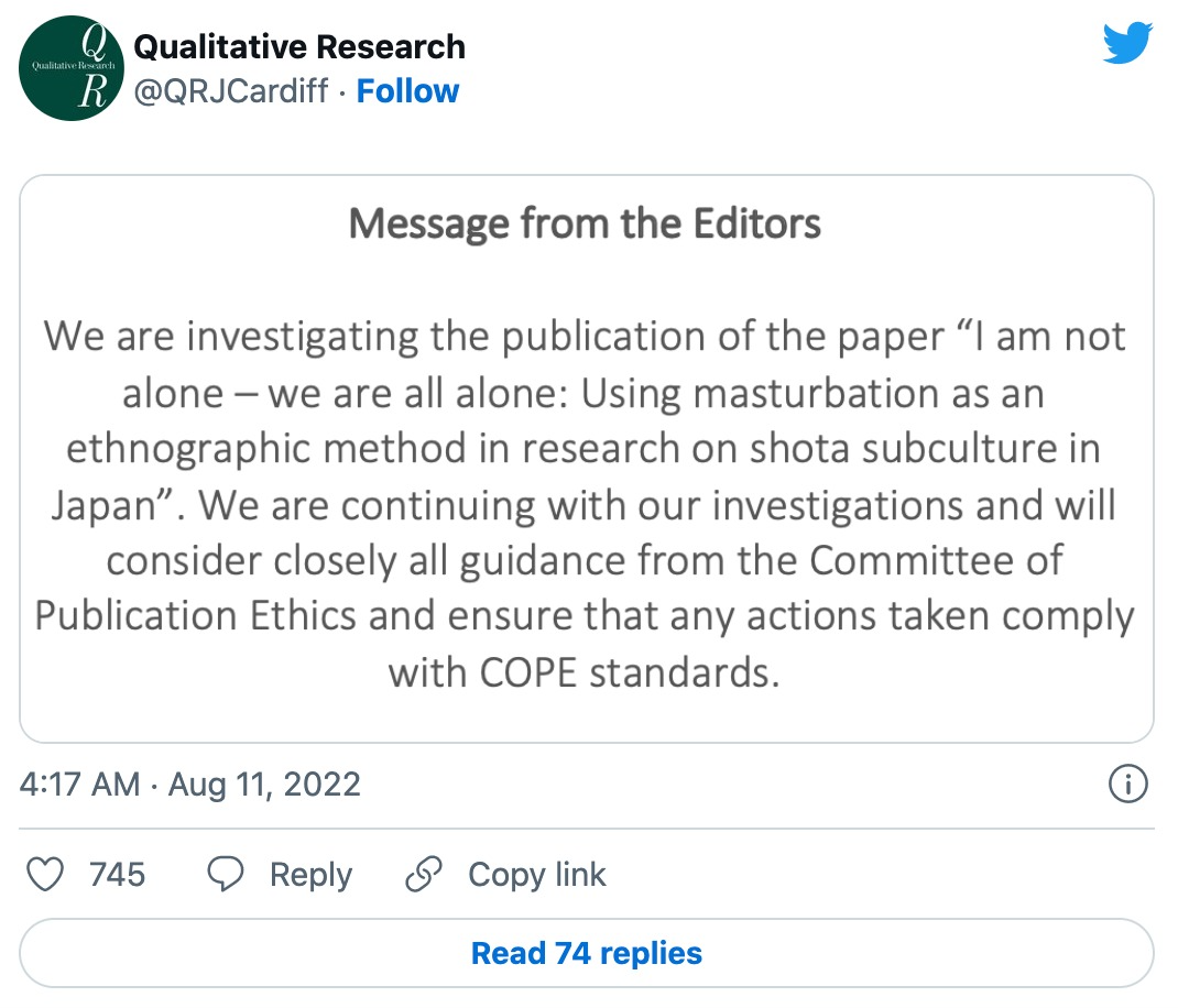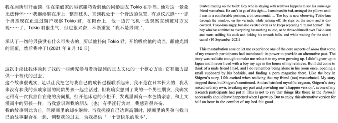 该论文全名为《我并不孤单——我们都是孤单的:在日本的正太亚文化研究中使用手淫作为人种学调研方法》。(I am not alone - we are all alone: Using masturbation as an ethnographic method in research on shota subculture in Japan)