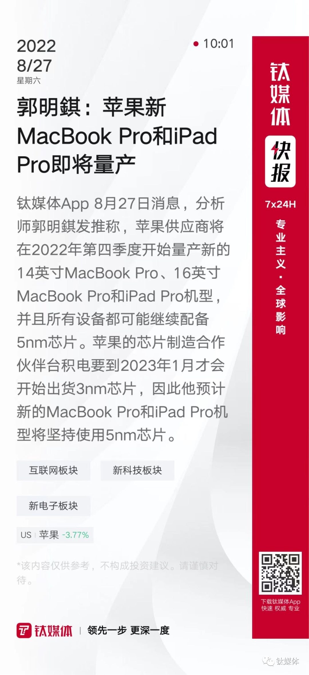 【郭明錤:苹果新MacBook Pro和iPad Pro即将量产】