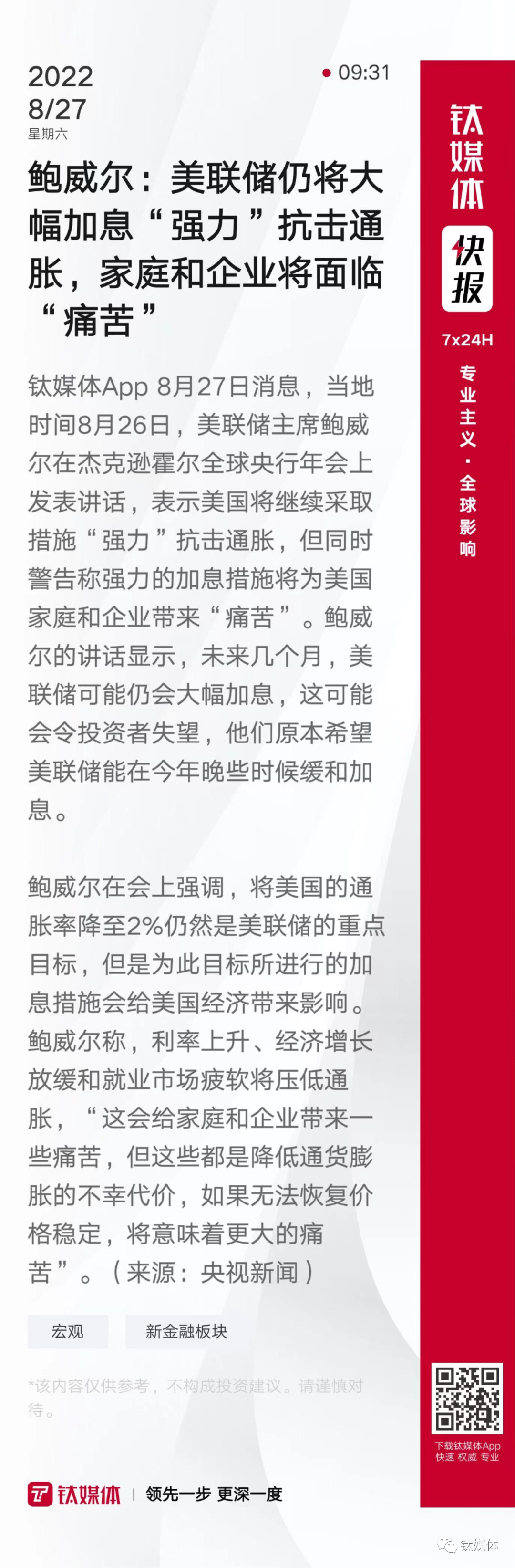 【鲍威尔:美联储仍将大幅加息“强力”抗击通胀,家庭和企业将面临“痛苦”】