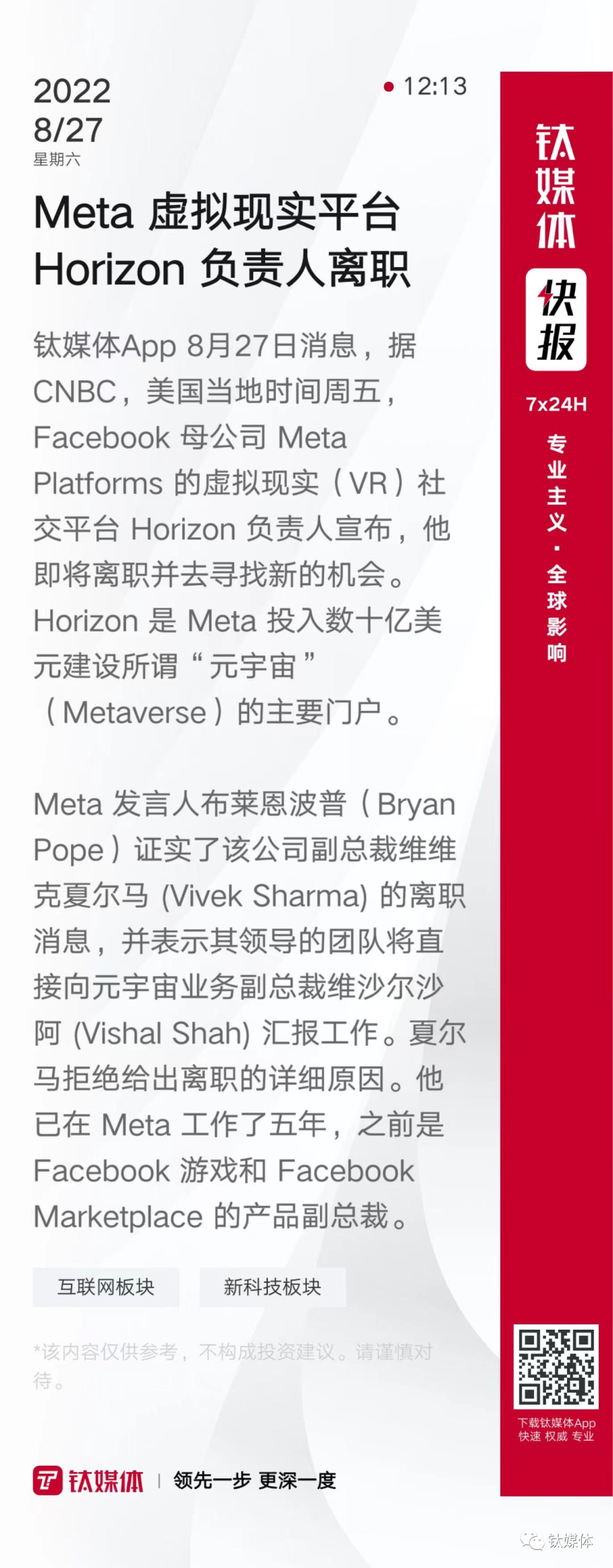 【Meta 虚拟现实平台 Horizon 负责人离职】