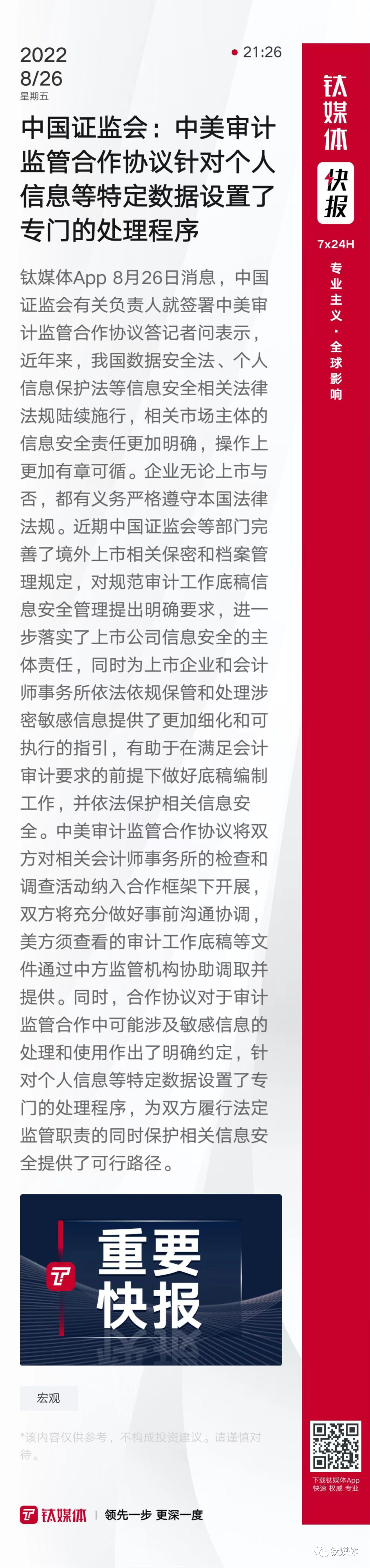 【中国证监会:中美审计监管合作协议针对个人信息等特定数据设置了专门的处理程序】