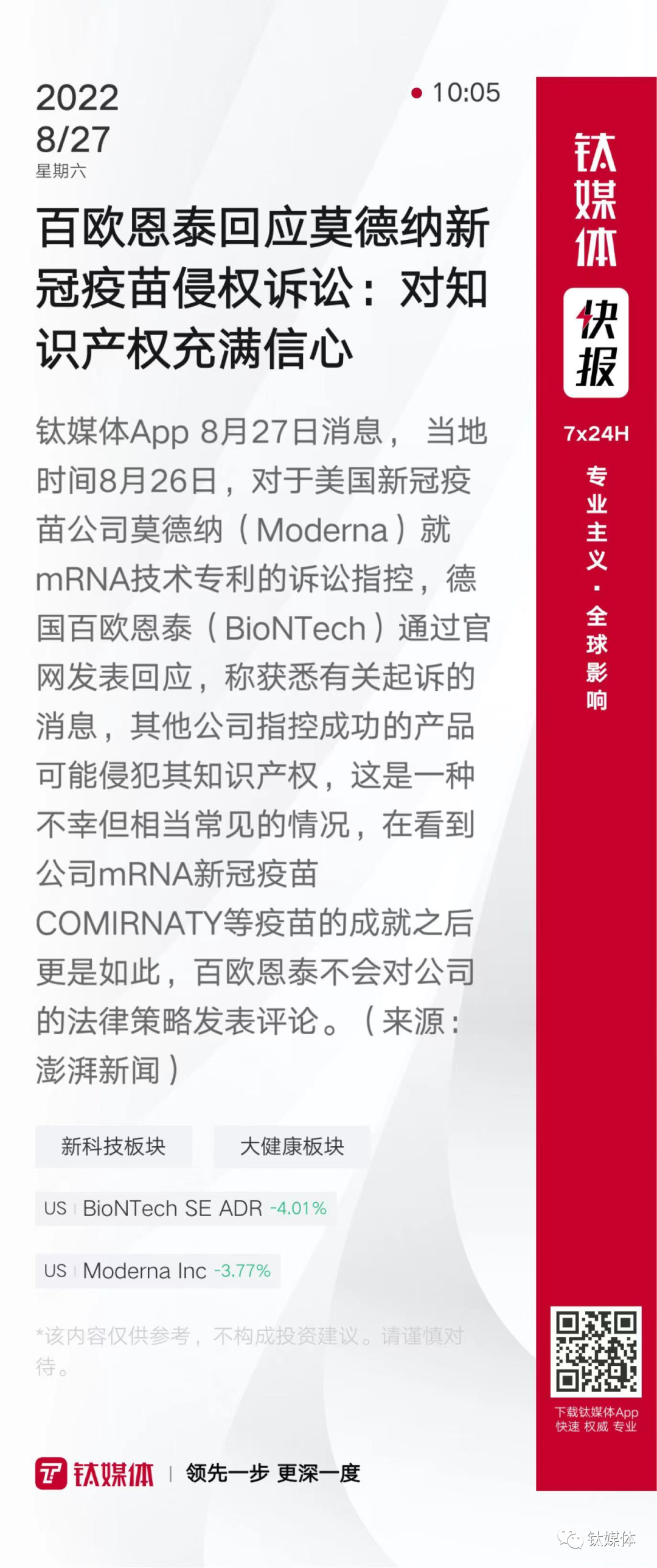 【百欧恩泰回应莫德纳新冠疫苗侵权诉讼:对知识产权充满信心】