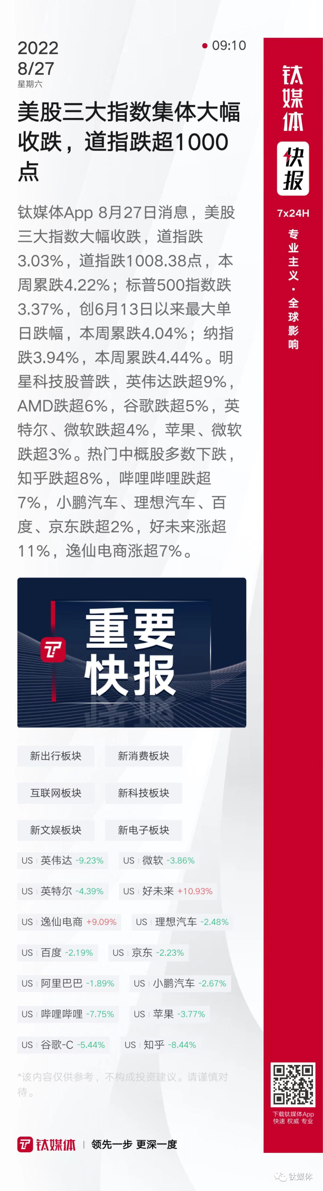 【美股三大指数集体大幅收跌,道指跌超1000点】