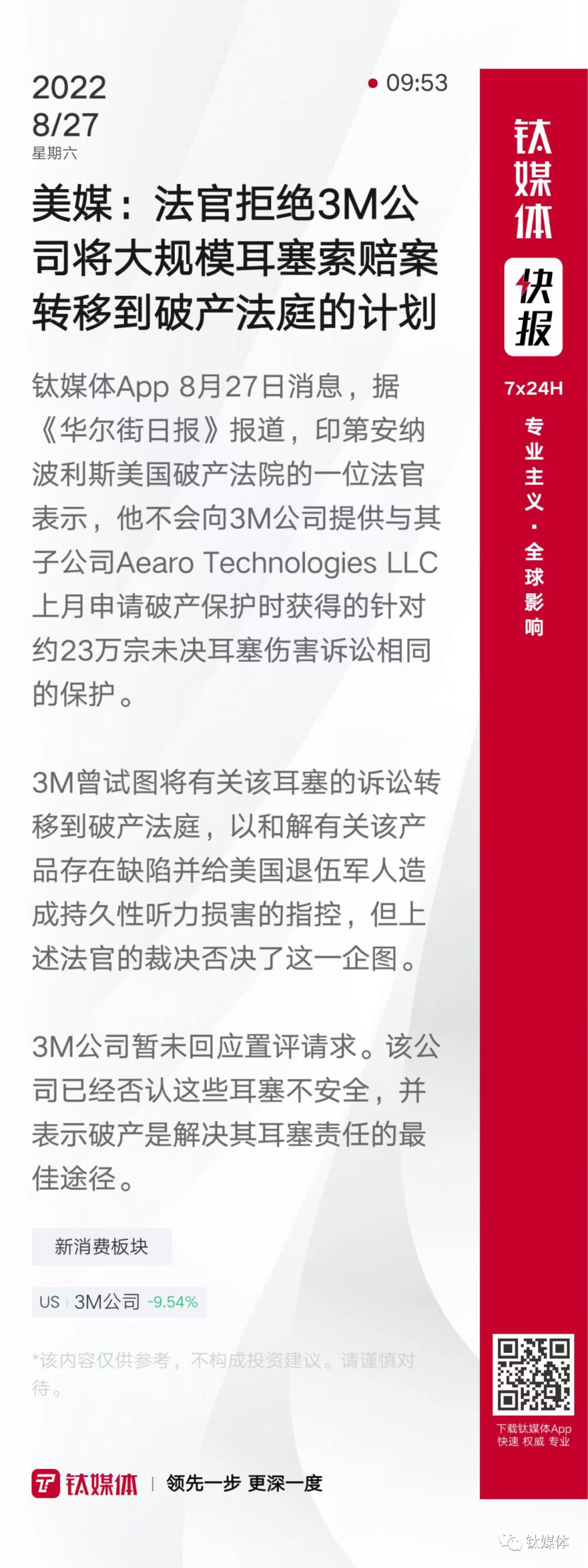 【美媒:法官拒绝3M公司将大规模耳塞索赔案转移到破产法庭的计划】