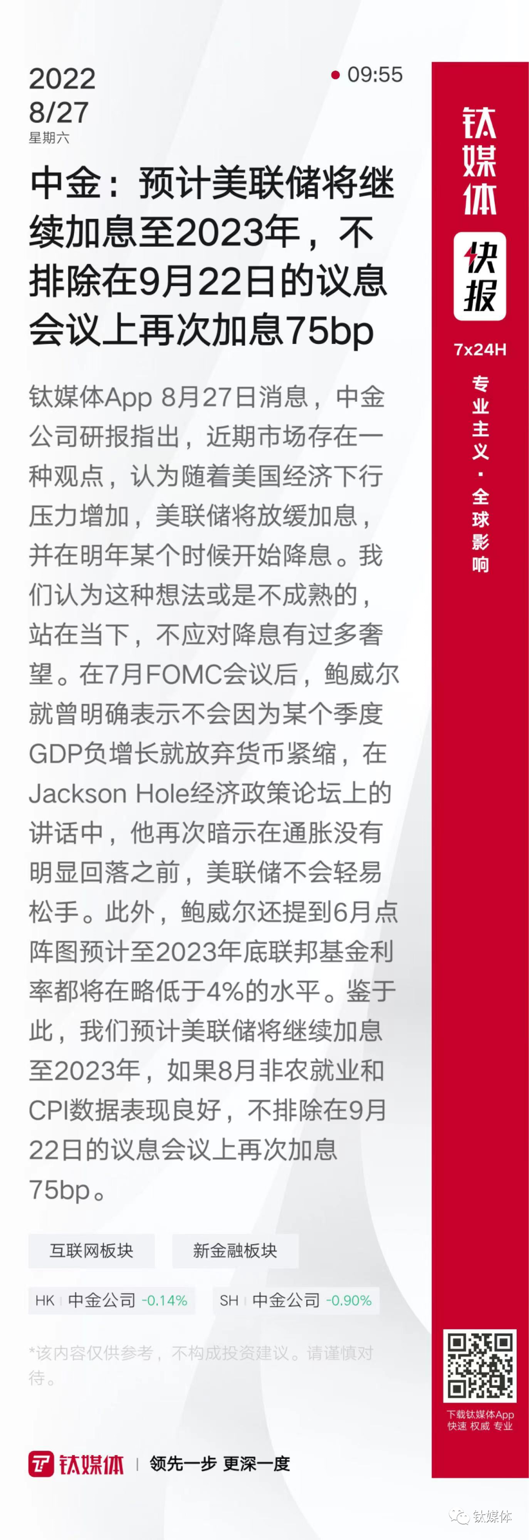 【中金:预计美联储将继续加息至2023年,不排除在9月22日的议息会议上再次加息75bp】