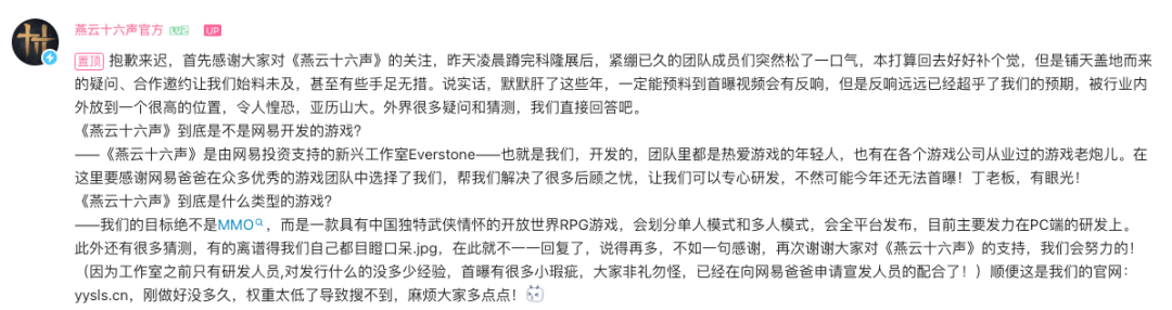 最近欧洲最大的游戏展会2022科隆游戏展(Gamescom 2022)正式召开,全球众多著名游戏公司都赴展并放出了自家游戏的最新情报。不过可能在看完各个大厂的播片之后,不少人被网易所放出的《燕云十六声》实机演示给吸引了过去。这款游戏由EVERSTONE开发、网易投资,已经研发了三年之久,并且将会登陆全平台。游戏背景设定在五代十国时期,游戏中没有门派设定,领悟武学可以依靠各种机缘。此外游戏中还添加了各种如点穴、受伤之后必须对症下药等等有特色以及有趣的玩法。不少玩家在看完实机演示之后表示非常惊艳,表示终于能看到又一款国产武侠3A大作了,特别是不少热爱武侠类游戏的玩家更是对其表示了高度的关注。于是便有不少玩家跑到《燕云十六声》官网想要预约,不过当他们点击预约按钮之后便看到了——好家伙,原来你说的“全平台”是指算上移动端的全平台。而看到这,不少玩家都表示:懂了,网易这是想学《原神》,做一个多端同步的RPG游戏。瞬间不少人对这款游戏就失去了期待。而官方随后也对于网游的问题做出了回答:我们的目标绝对不是MMO,也就是多人联机网游,会划分单人模式和多人模式,目前主要发力在PC端的研发上。