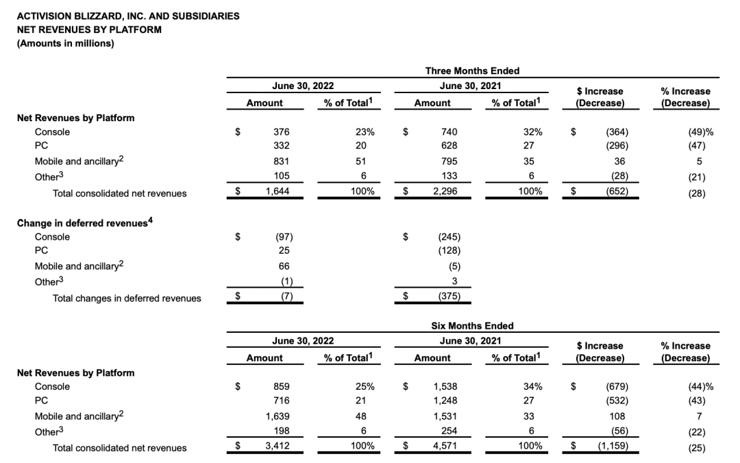 作为一家公司,赚钱当然才是重中之重,而如今最赚钱的游戏种类是什么?那没得说肯定就是手游了(当然不包括买断制无内购手游)。根据研究机构Sensor Tower发布的7月全球手游收入榜单中,全球收入最高的手机游戏是来自腾讯的《王者荣耀》,玩家贡献了2.258亿美元,其中约94.6%的收入来自国内。第二名是《PUBG Mobile》,7月总收入为1.643亿美元,其中约69%自国内,也就是《和平精英》手游。我们再来比一比全球最赚钱的游戏公司之一任天堂,根据其发布的2022-2023财年第一季度财报,该季度任天堂销售额达3074.60亿日元(约合22.4亿美元),营业利润1016.47亿日元(约合7.4亿美元)。看起来任天堂收入比手游高很多,但是要知道,这是用一个季度的营业额去对比一个游戏一个月的收入,而且任天堂这一个季度的收入除了卖游戏之外,还有主机、会员等其他方面的收入。我们再看另一个例子,动视暴雪在之前一直是以PC、主机端的游戏为我们所知,而就在动视暴雪第二季度的财报中我们可以看到,在mobile and ancillary也就是“移动和辅助”这一项中收入为8.31亿美元,而PC、主机以及Other也就是发行等方面的收入加起来也才8.13亿美元。也就是说在该季度移动端的收入占据了动视暴雪收入的一半。如今再看到这张图,不知道大家会怎么想。不过至少动视暴雪的高层肯定希望大家再多几台手机。所以为什么现在不少游戏厂商都开始推出免费手游,并且想把自己的经典IP推出移动版,相信大家看完也就能够明白了,免费的才是最贵的。显而易见,未来肯定会出现更多的手游,并且手游在画质、内容等方面也会越来越丰富,但是想要追上主机与PC还有很长的路要走。还是上面所说的,硬件功耗以及续航方面的先天差距导致。当然也有一些PC、主机游戏厂商会推出手游用以强化自己的营收能力。事实上PC、主机和移动端之间是两个不同的赛道,不能以营收论英雄。真正的好游戏不论平台,也不能以营收判断一款游戏的好坏。3A大作会有其不足之处,氪金手游可能也会有其亮点。总之来说就是玩游戏,按照自己喜欢的方式来就是最好的,没有高低贵贱之分,不用去管别人说什么,也没有必要去嘲讽他人。