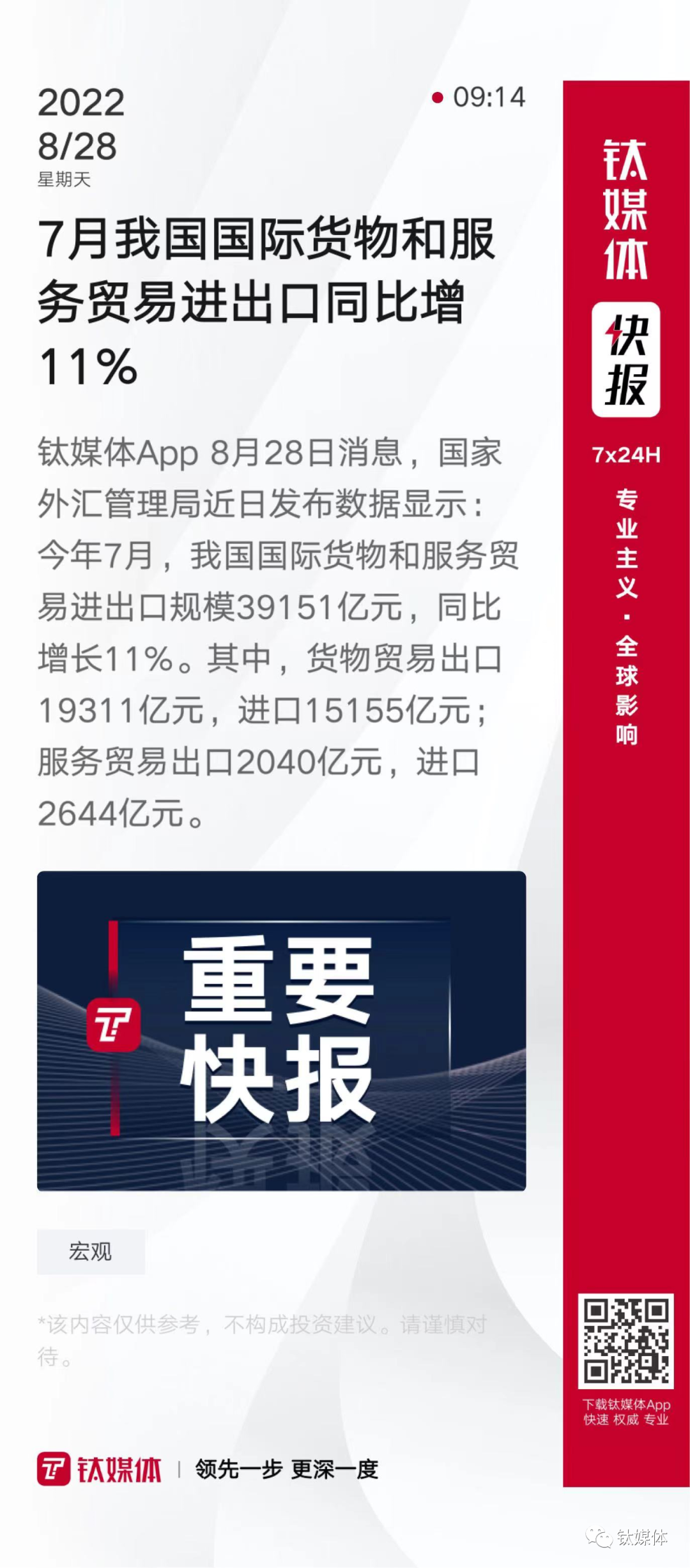 【7月我国国际货物和服务贸易进出口同比增11%】