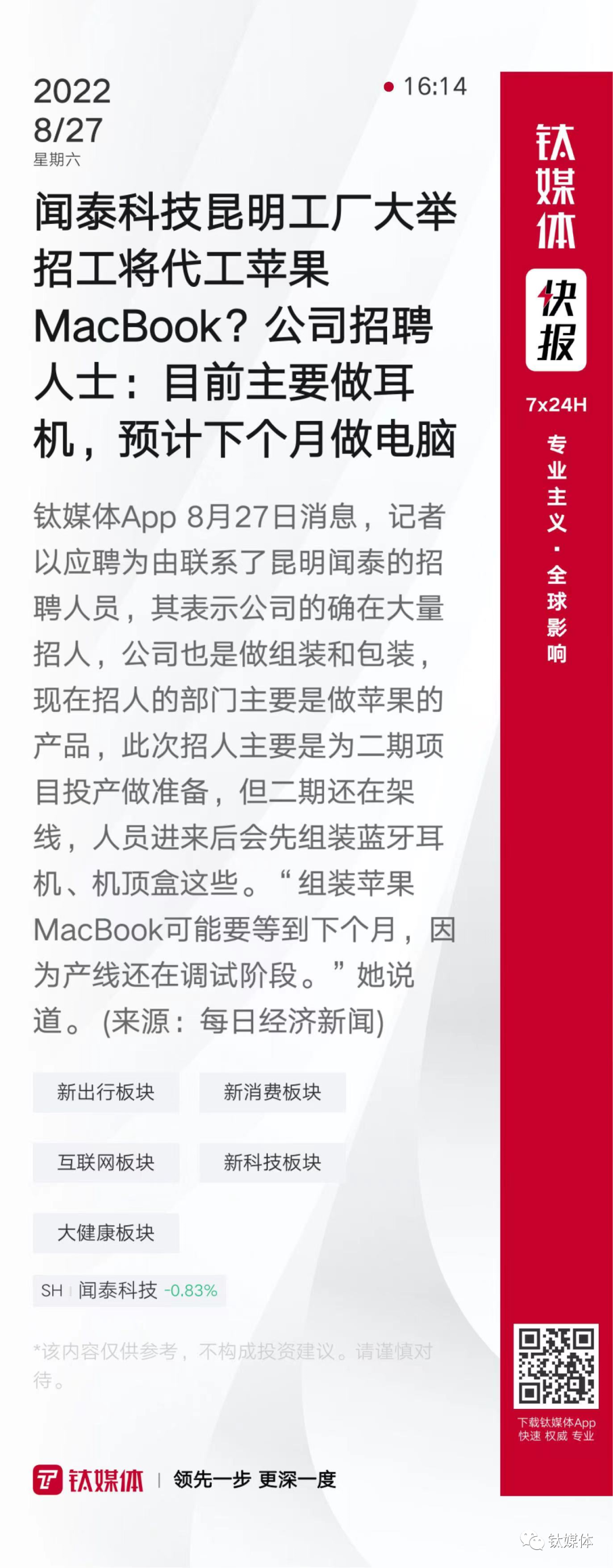 【闻泰科技昆明工厂大举招工将代工苹果MacBook?公司招聘人士:目前主要做耳机,预计下个月做电脑】