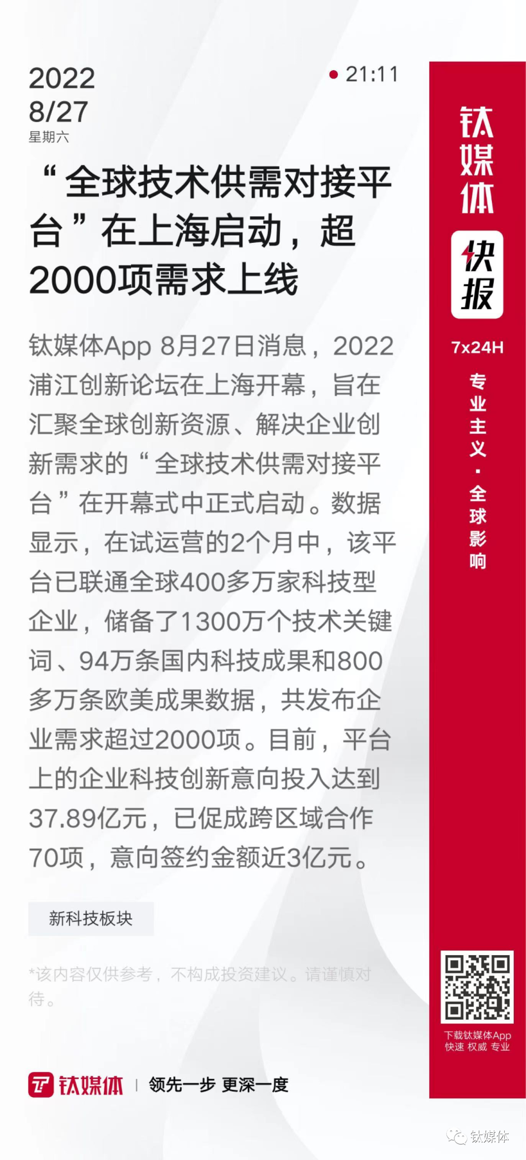【“全球技术供需对接平台”在上海启动,超2000项需求上线】