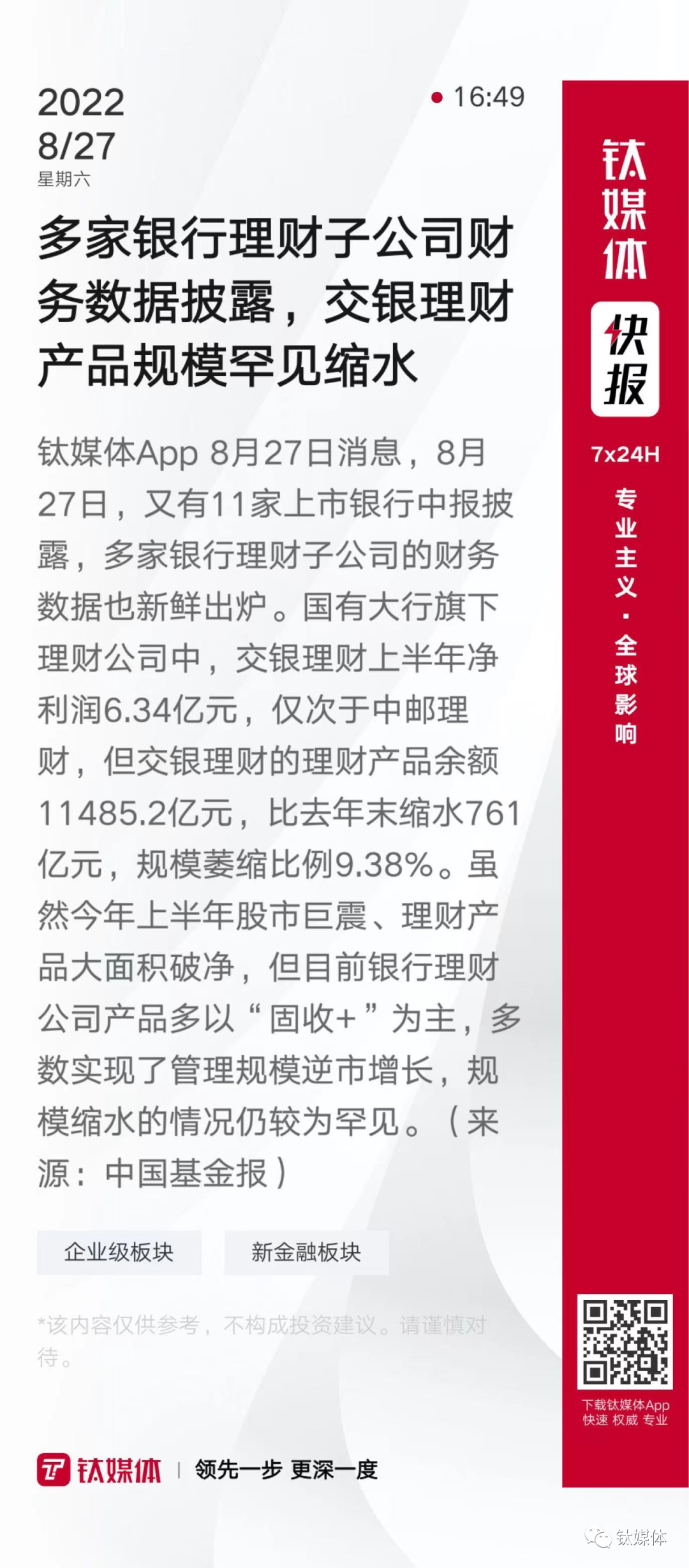 【多家银行理财子公司财务数据披露,交银理财产品规模罕见缩水】